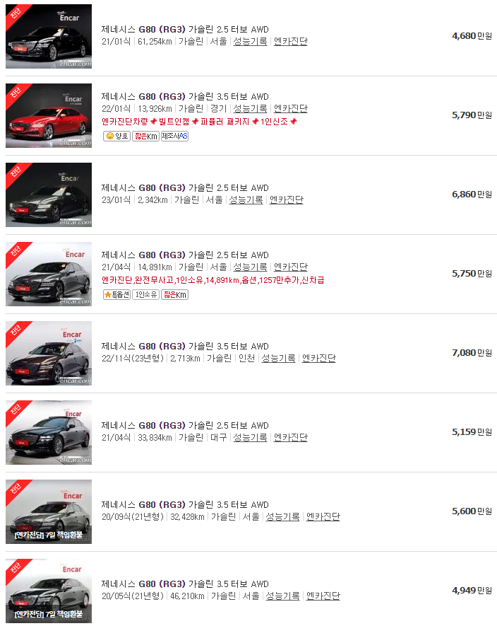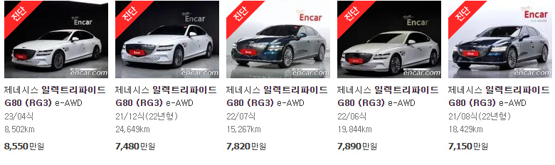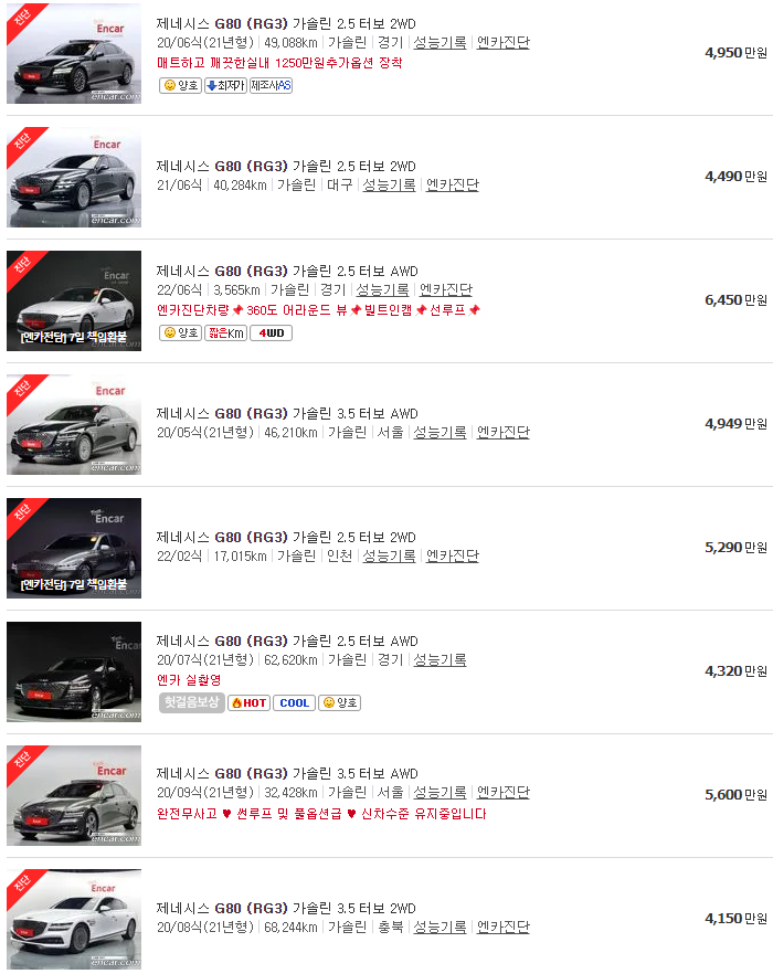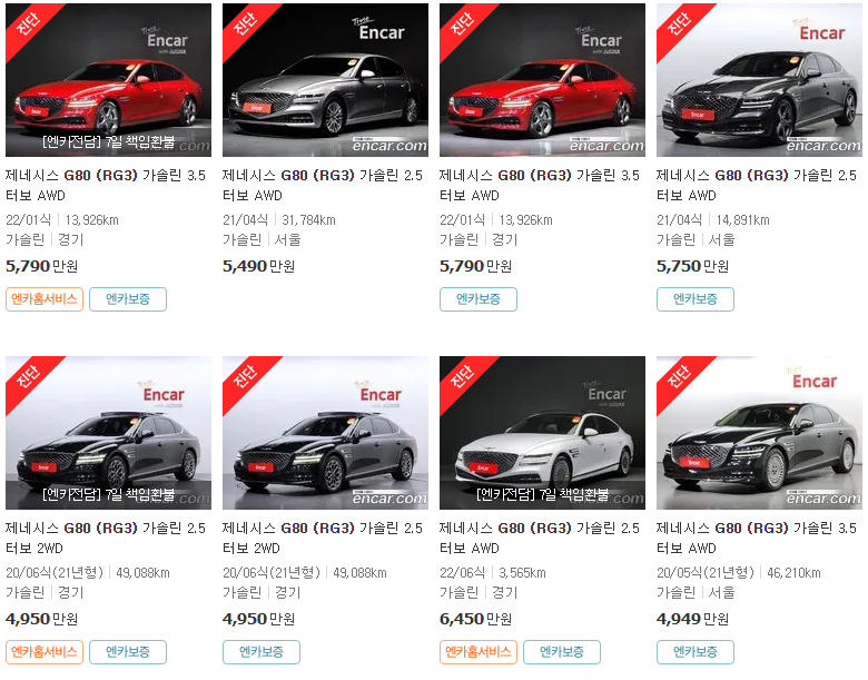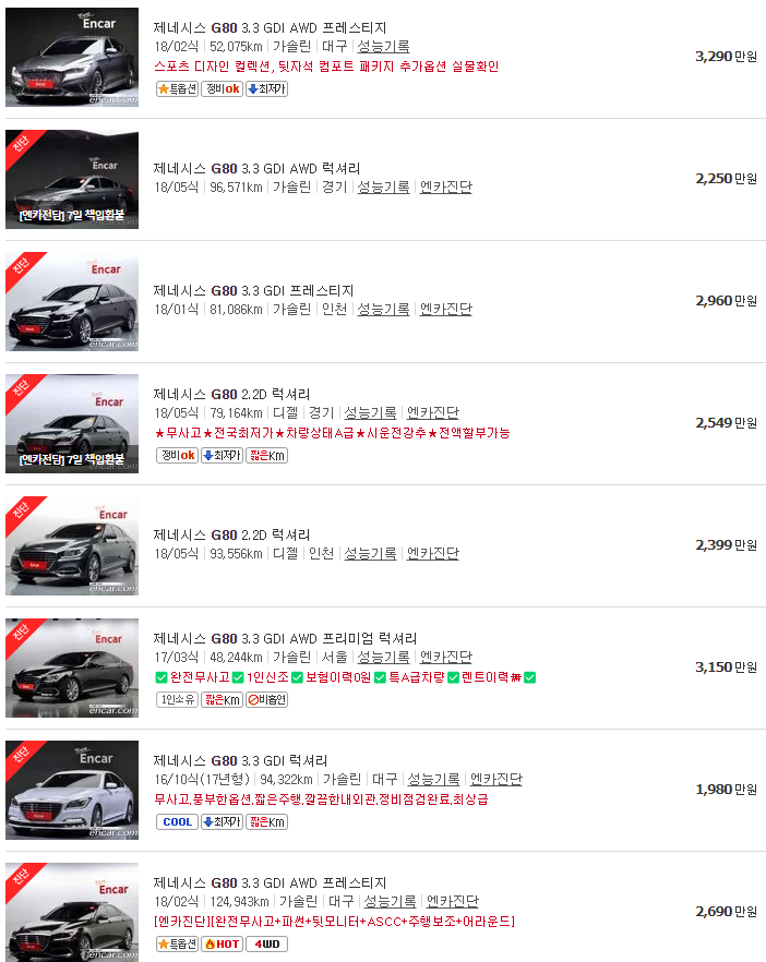 🚗🚗 가장 이용자가 많은 엔카에는 제네시스 G80 중고차 매물이 약 3198대 등록되어 있습니다. 아래는 현재 중고차 시장에서의 제네시스 G80 중고차 시세와 매물표입니다.