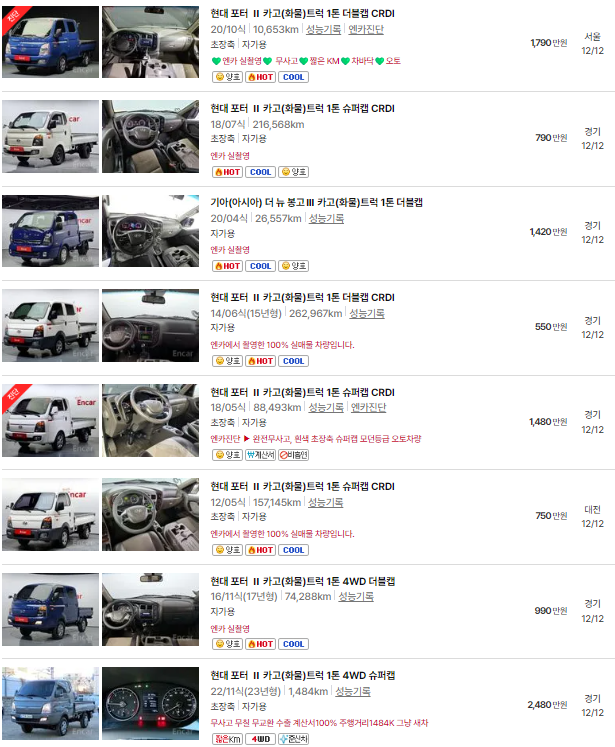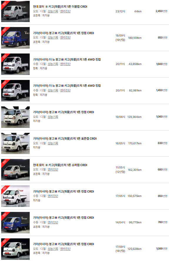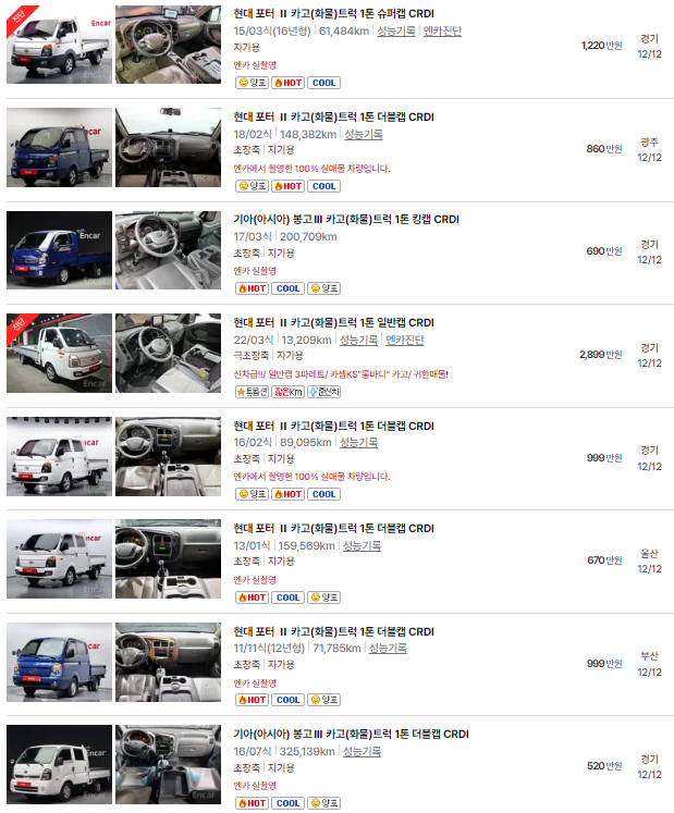 1톤 트럭 중고차 시세표입니다. 우리나라에서 가장 유명한 중고차 매매사이트인 엔카 사이트에 등록된 중고차 매물 기준입니다. 참고로 국내 중고차 사이트는 엔카, KB차차차, 보배드림 등이 있습니다.