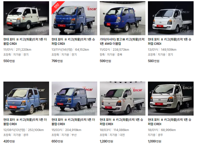 여기까지 1톤 트럭의 중고차 가격을 알아보았습니다. 1톤 트럭 중고차 시세가 궁금하셨던 분들은 위 가격표 또는 엔카, Kcar, KB차차차와 같은 중고차 시세 사이트를 참고해서 구매하시면 좋을 것 같습니다.
