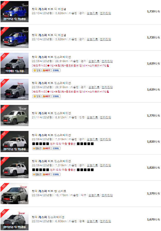 가장 이용자가 많은 엔카에는 캐스퍼 중고차 매물이 약 360대 등록되어 있습니다. 아래는 현재 중고차 시장에서의 캐스퍼 중고차 시세와 매물표입니다.