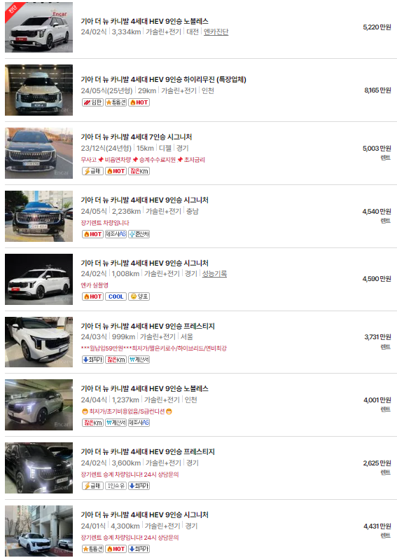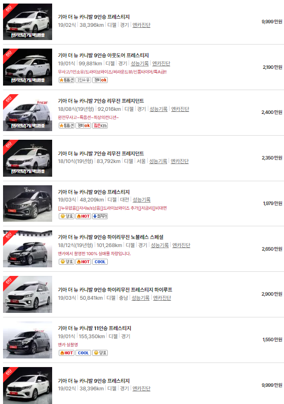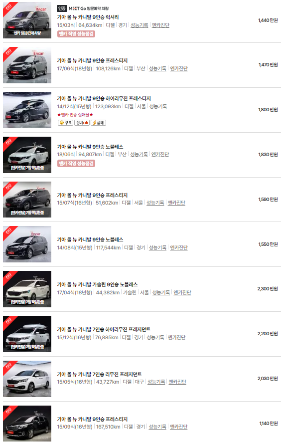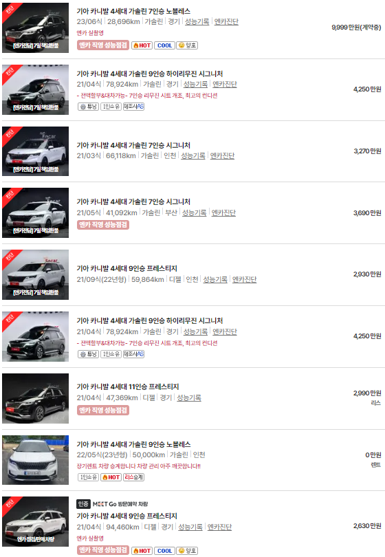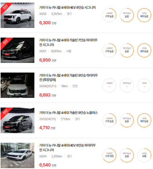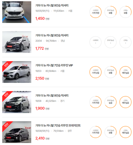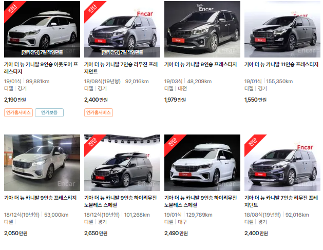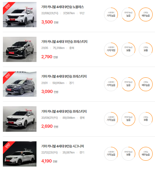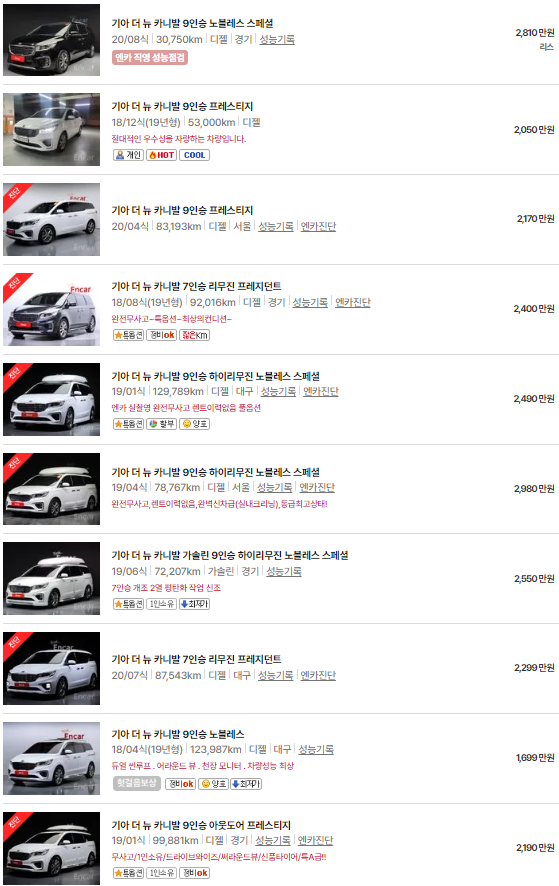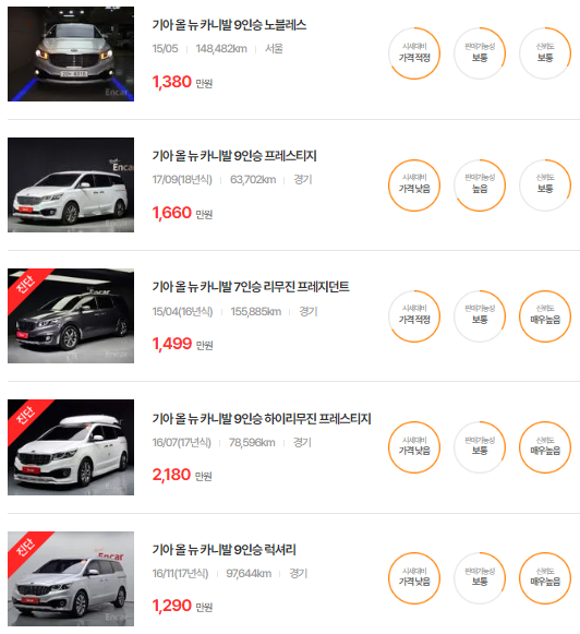 🚗🚗 가장 이용자가 많은 엔카에는 카니발 중고차 매물이 약 7198대 등록되어 있습니다. 아래는 현재 중고차 시장에서의 카니발 중고차 시세와 매물표입니다.