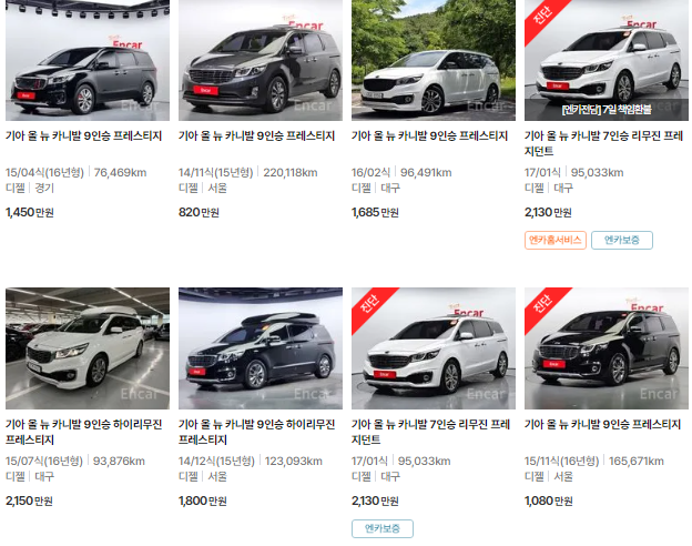 카니발 중고차 시세표입니다. 우리나라에서 가장 유명한 중고차 매매사이트인 엔카 사이트에 등록된 중고차 매물 기준입니다. 참고로 국내 중고차 사이트는 엔카, KB차차차, 보배드림 등이 있습니다.