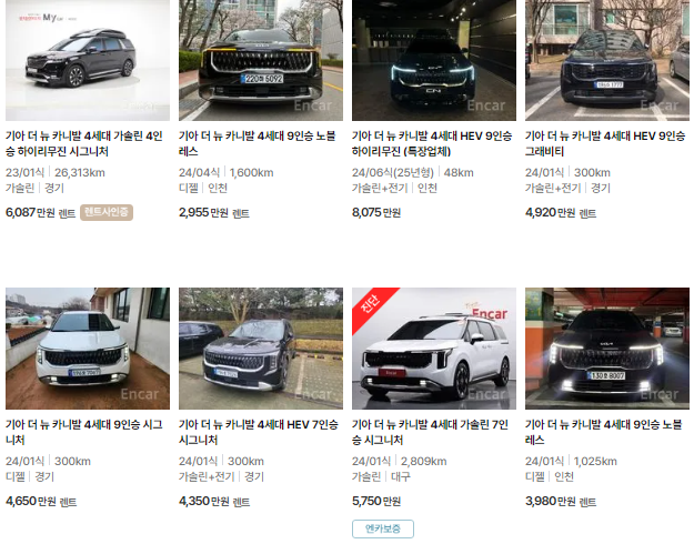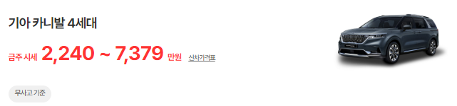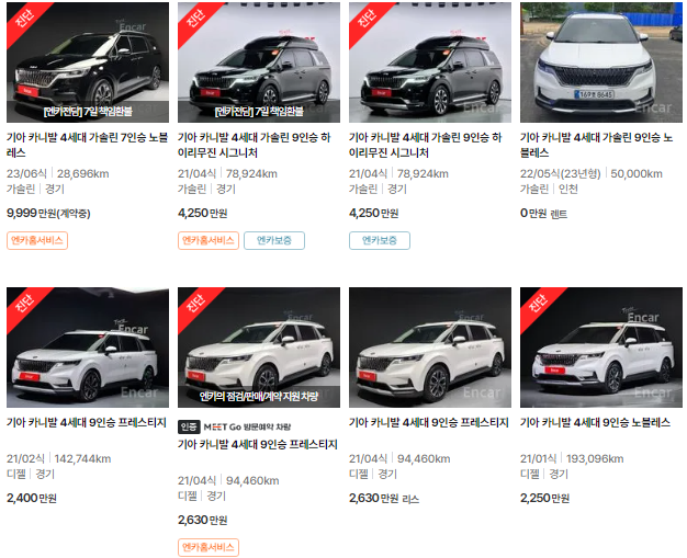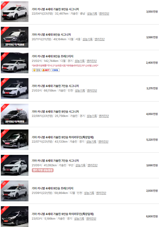 카니발 4세대는 2020~2023년식 카니발 모델이며, 중고차 시세는 2227~7357만 원입니다. 아래는 현재 중고차 시장에 매물로 나와있는 카니발 4세대의 중고차 시세와 가격표입니다.