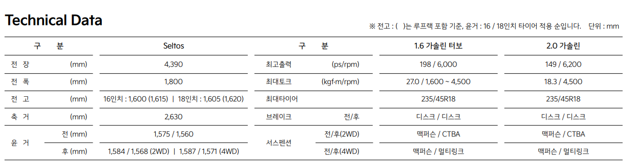 셀토스 성능 제원표