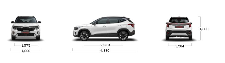 셀토스의 크기는 전장 4375mm, 전폭 1800mm, 전고 1600~1605mm, 축거 2630mm입니다.