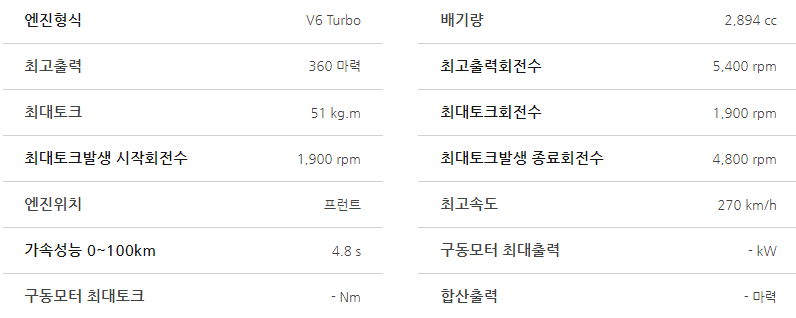 - 엔진: 2.9L V6 트윈 터보 엔진 (353마력)