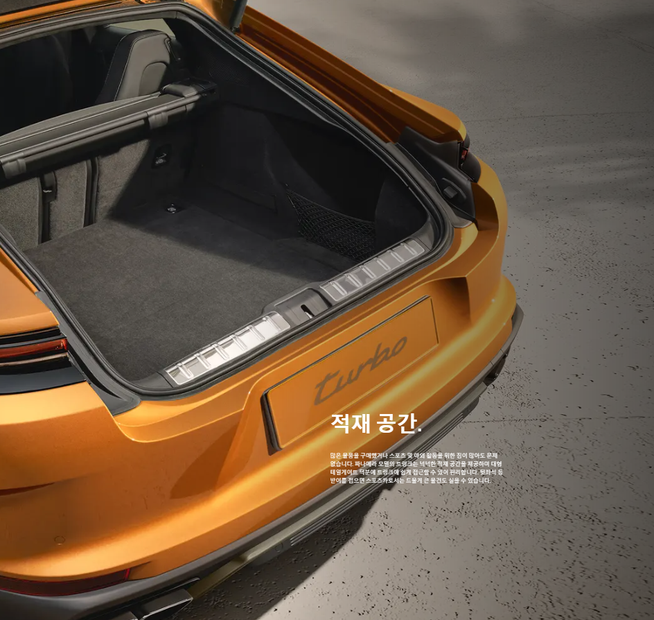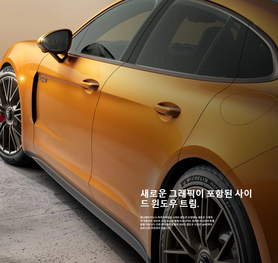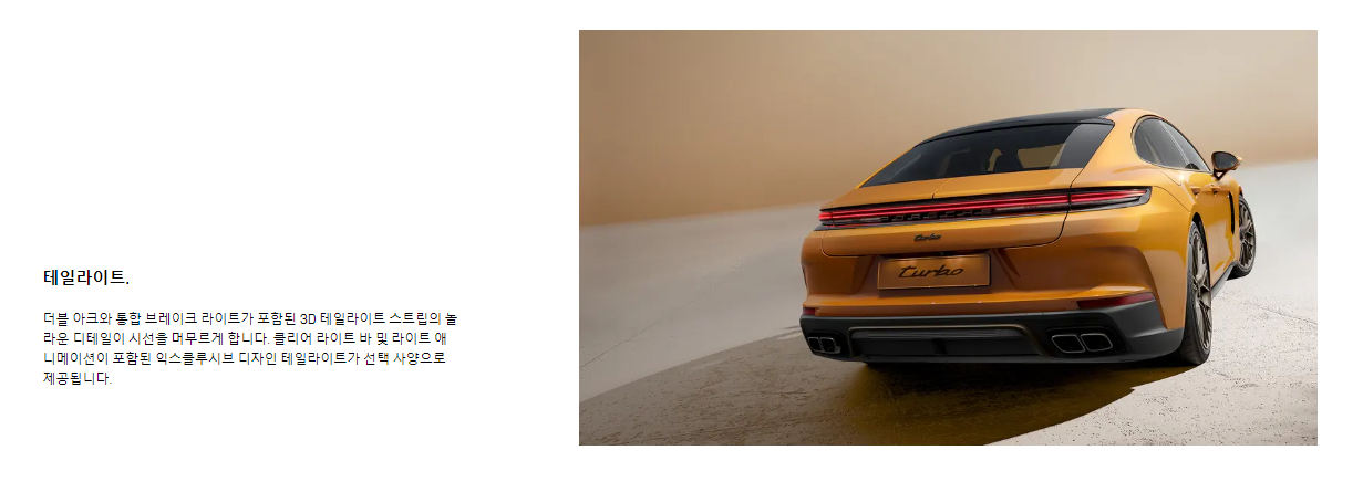 - 포르쉐 패밀리룩:포르쉐 특유의 4점식 LED 헤드램프와 3차원 디자인의 테일램프가 인상적입니다.