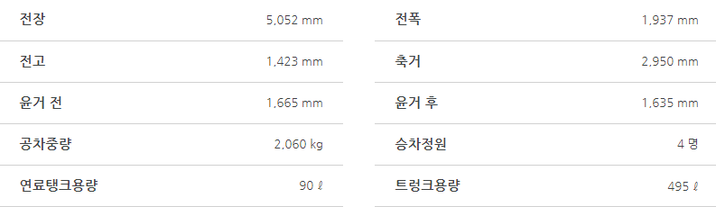 파나메라4의 크기는 전장 5052mm, 전고 1423mm, 전폭 1937mm, 축거 2950mm입니다.