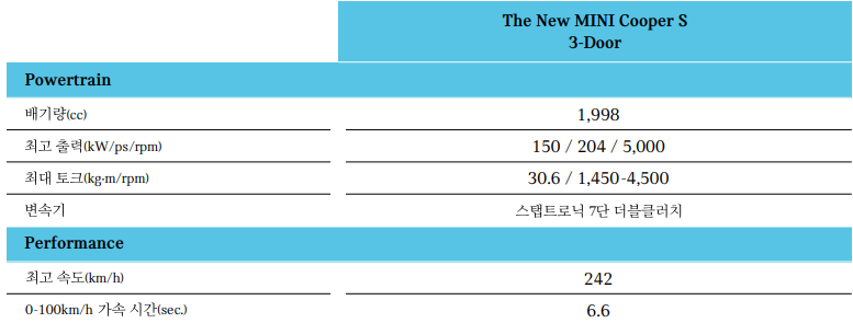 미니 쿠퍼 성능 제원표