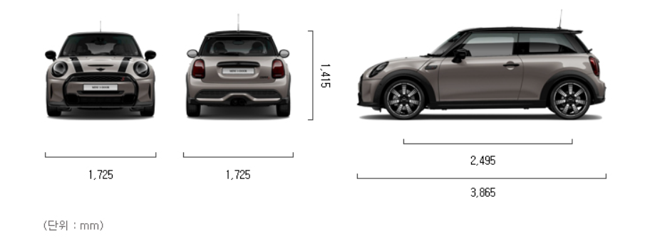 미니 쿠퍼의 크기는 전장 3865mm, 전폭 1725mm, 전고 1415mm, 축거 2495mm입니다.