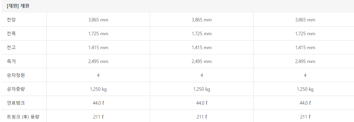 아래는 미니 쿠퍼의 제원표입니다. 차량의 성능에 대해서 상세하게 알아보도록 하겠습니다.