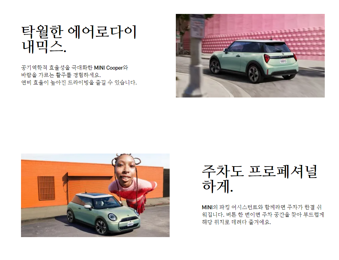 - 독특하고 개성 넘치는 디자인: 둥근 라운드 형태의 디자인과 다양한 색상 조합은 미니 쿠퍼만의 아이덴티티를 확립했습니다.