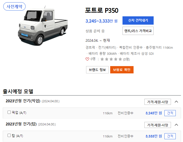 포트로 P350 | 경트럭 | 3,245만원~ | 물류 및 운송 소비자 |