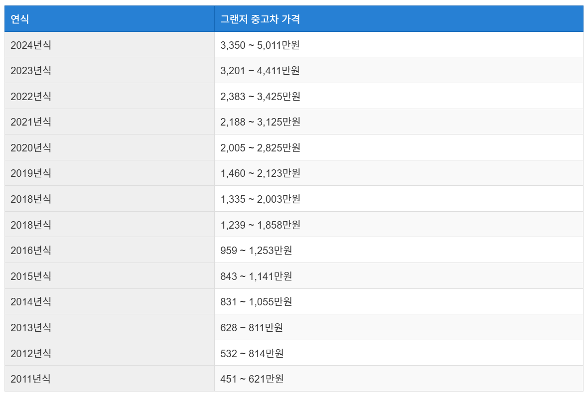 현대 그랜저의 중고차 가격은 연식, 주행 거리, 상태 등에 따라 다르지만, 전반적으로 안정적인 가격대를 유지하고 있습니다. 아래는 최신 기준에 따라 정리한 현대 그랜저의 가격입니다.