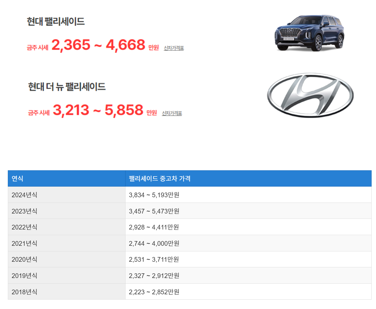 현대 팰리세이드 연식별 중고차 시세