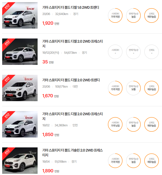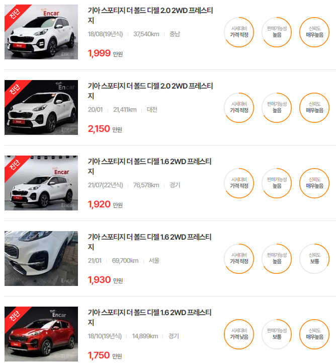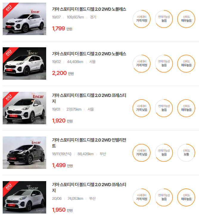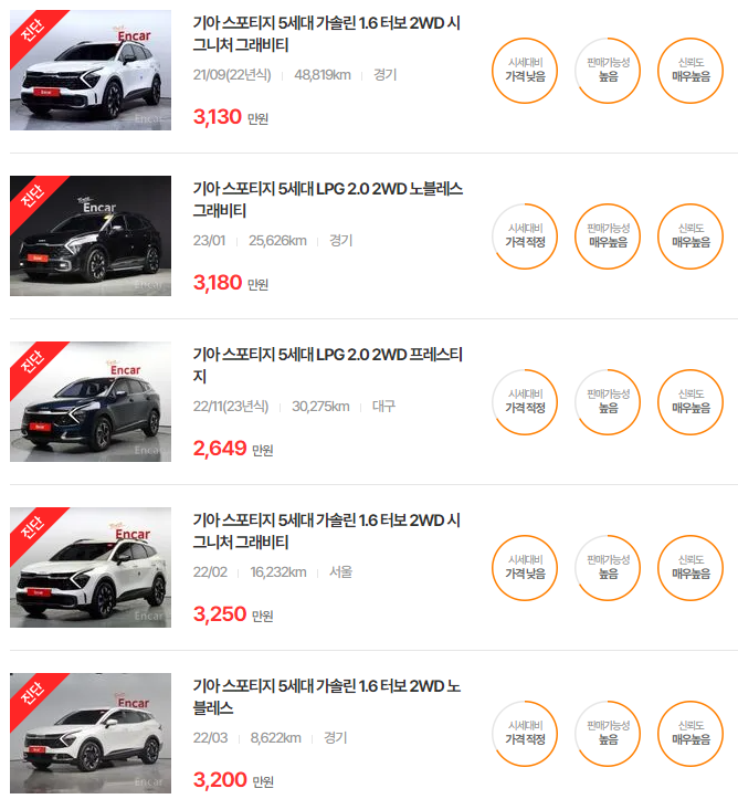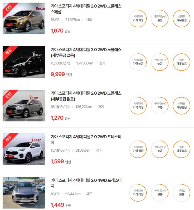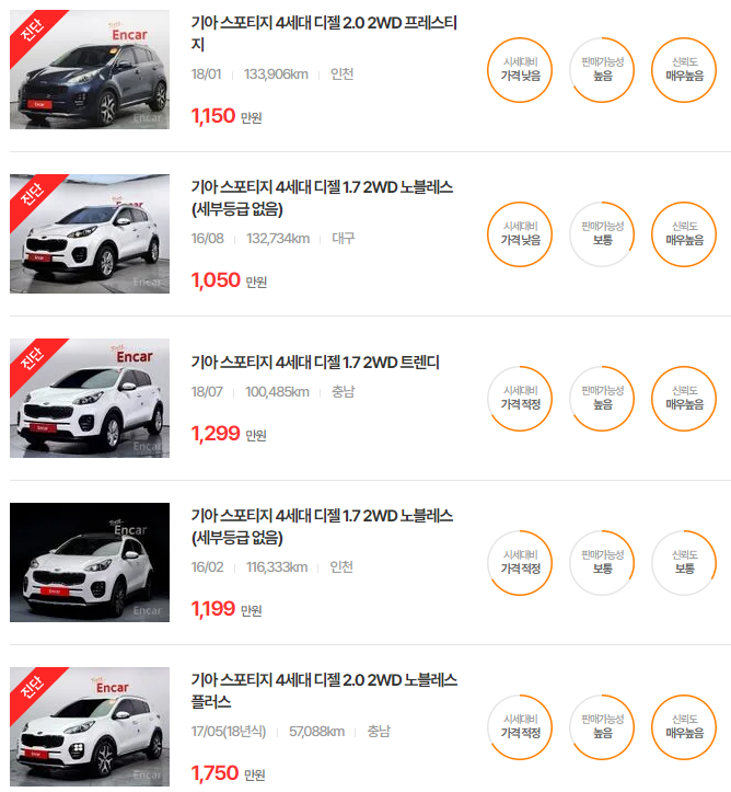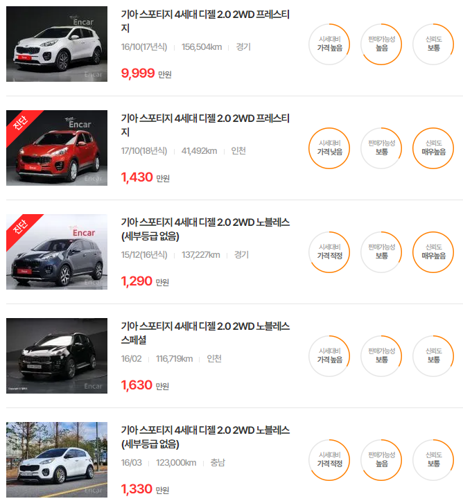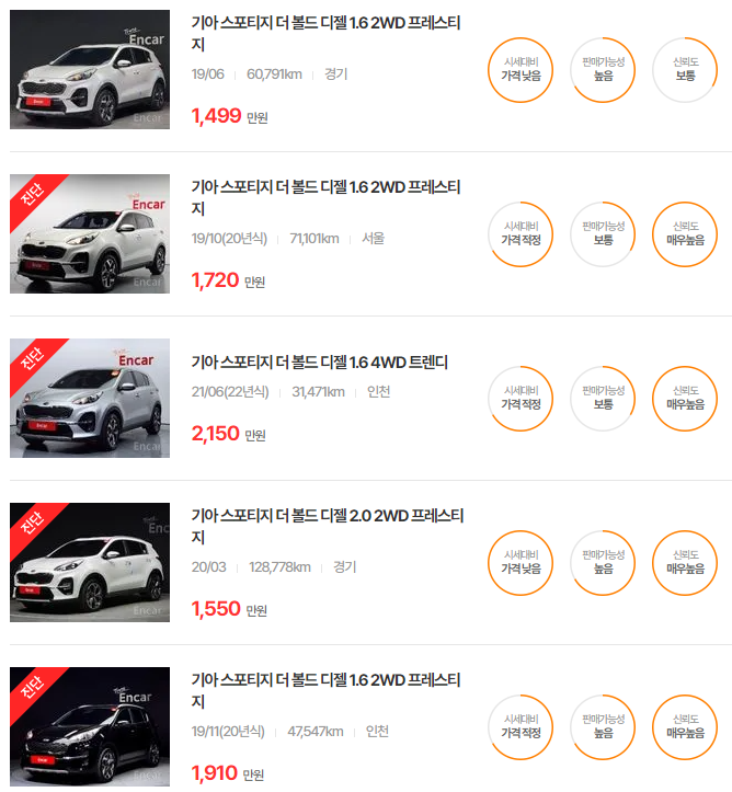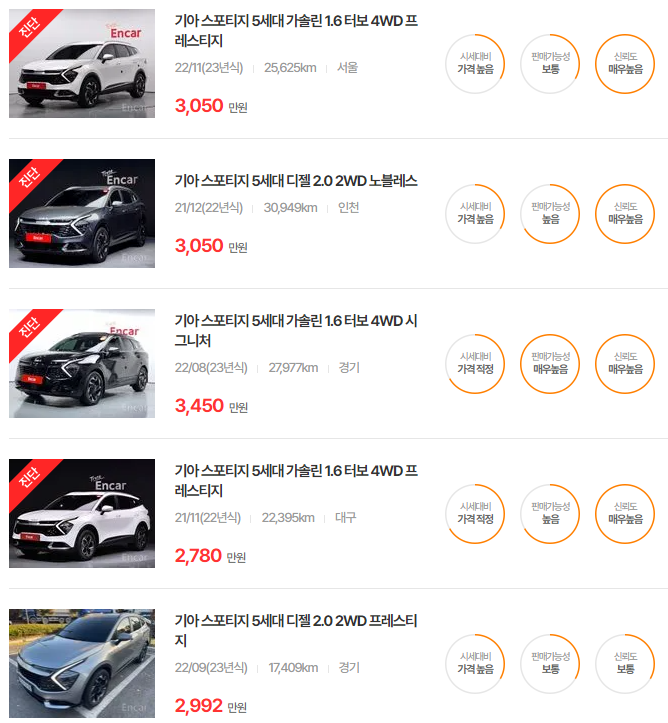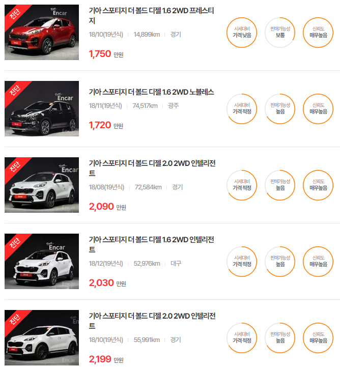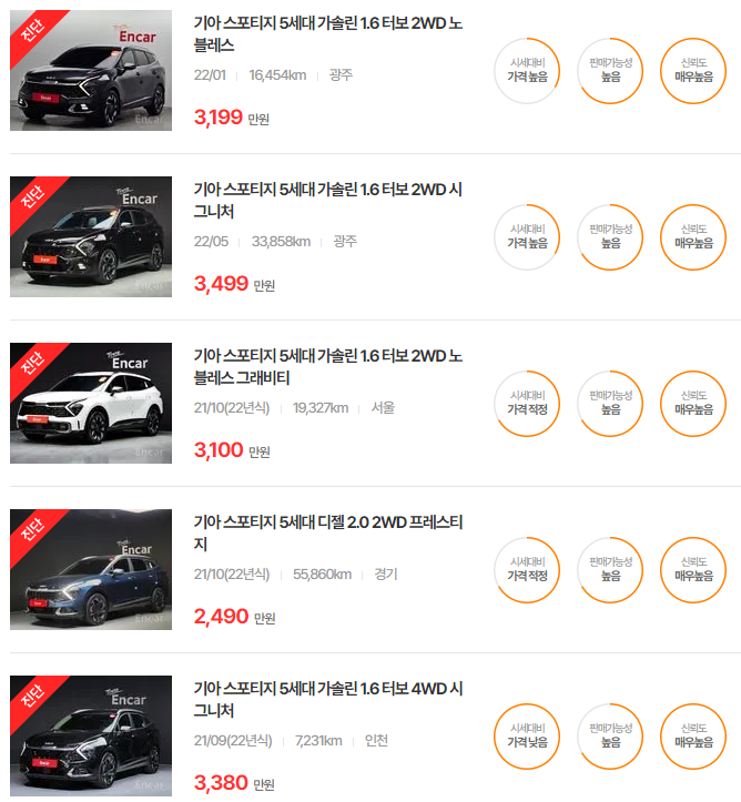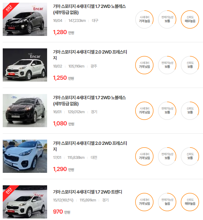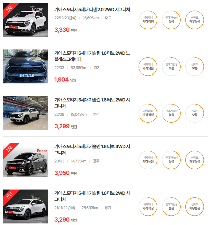 각 연식별로 살펴보면, 최신 모델일수록 상대적으로 높은 가격대가 형성되고 있습니다. 디 올 뉴 스포티지는 특히 높은 재판매 가치를 지니고 있으며, 2021년형 이상은 지속적으로 인기를 끌고 있습니다.