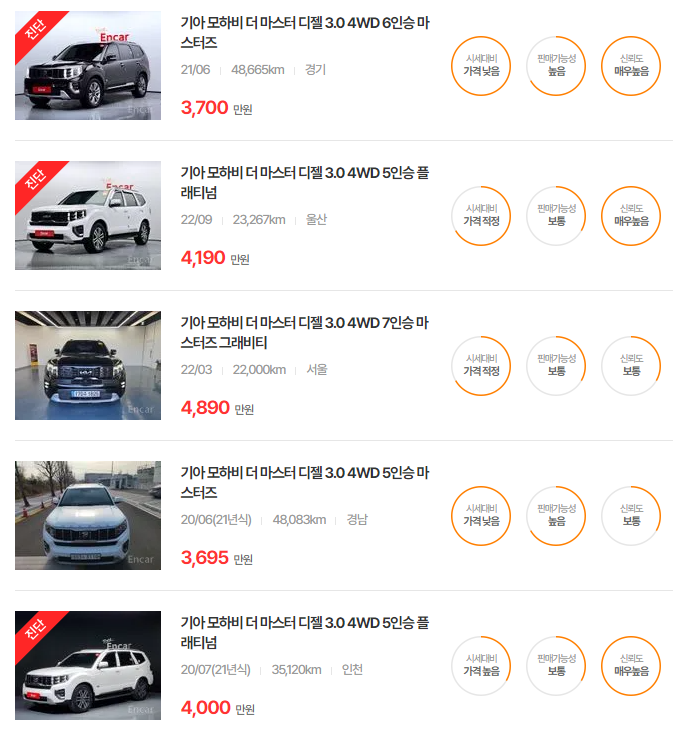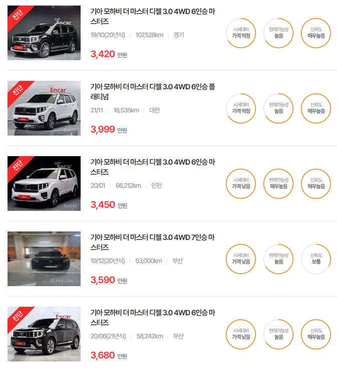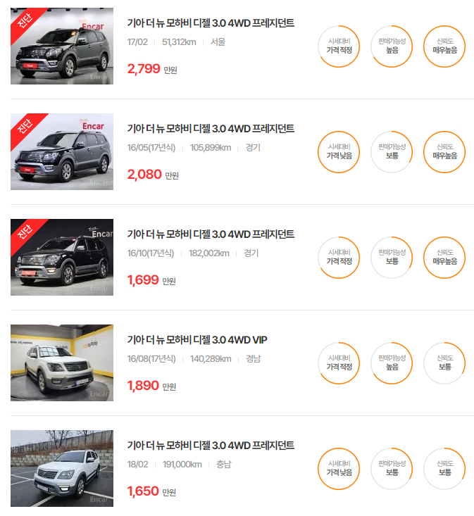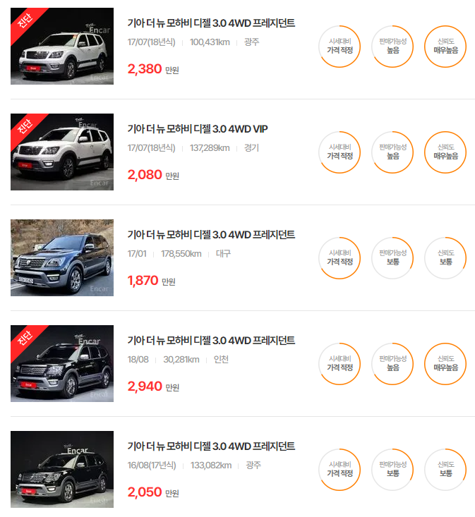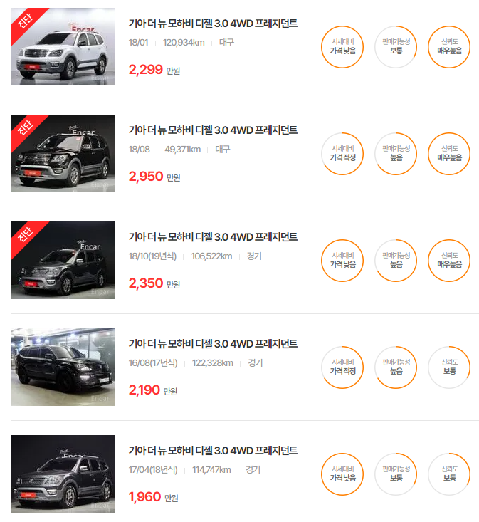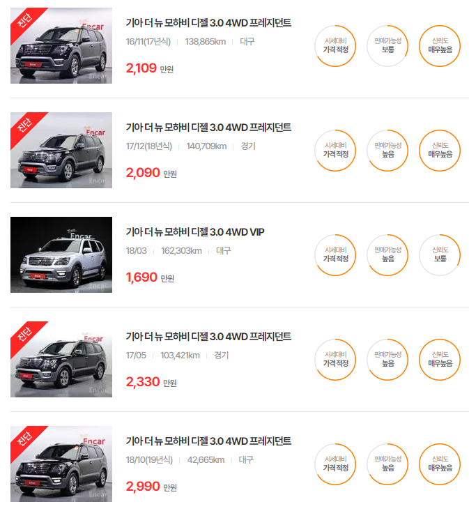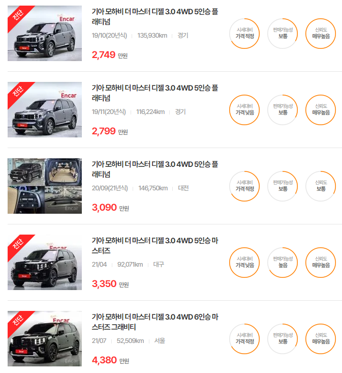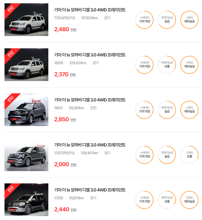 - 2019년식(더 뉴 모하비): 1,830~2,440만원