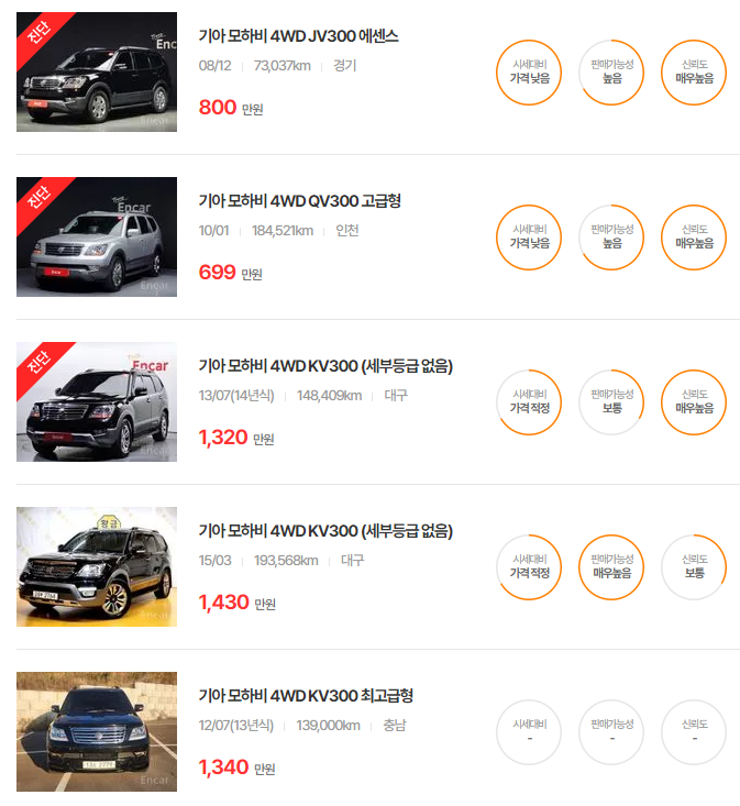 기아 모하비의 중고차 가격은 연식에 따라 다르며, 시간에 따라 조금씩 변동이 있습니다. 아래의 표는 2025년 5월 기준의 기아 모하비 연식별 중고차 가격대입니다.