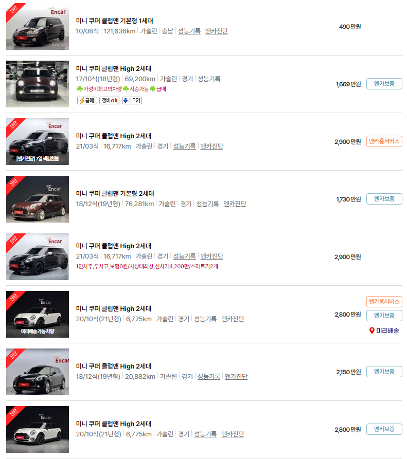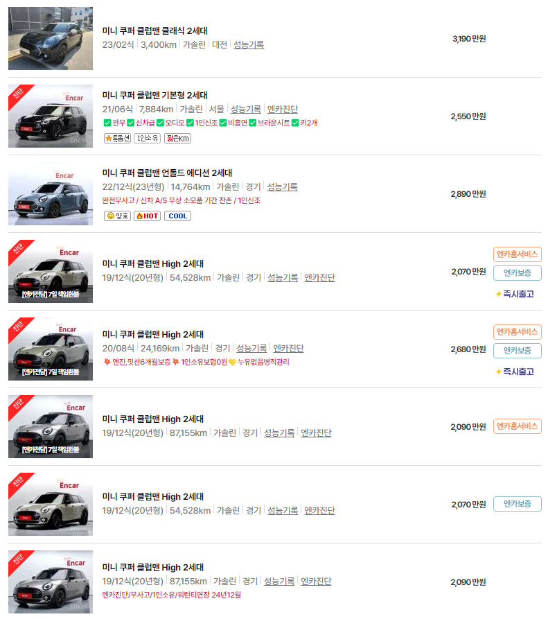 중고 미니 클럽맨의 가격은 차량의 세대와 상태에 따라 다양합니다. 여기서는 2021년식부터 2014년식까지 연식별 최신 시세를 소개합니다.