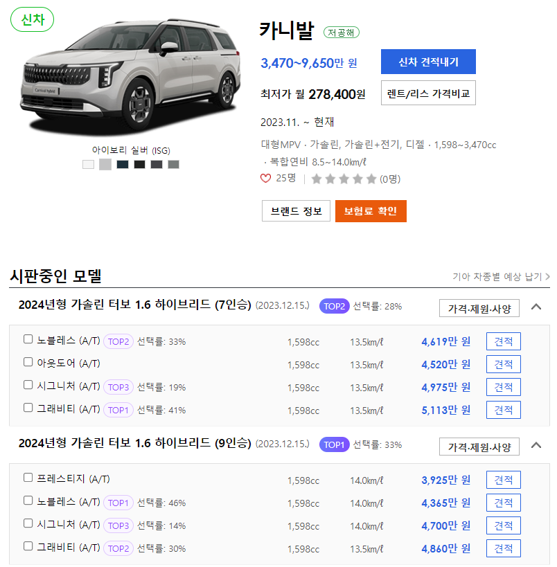 👇👇👇카니발 하이브리드 경쟁차량 신차 정보👇👇👇