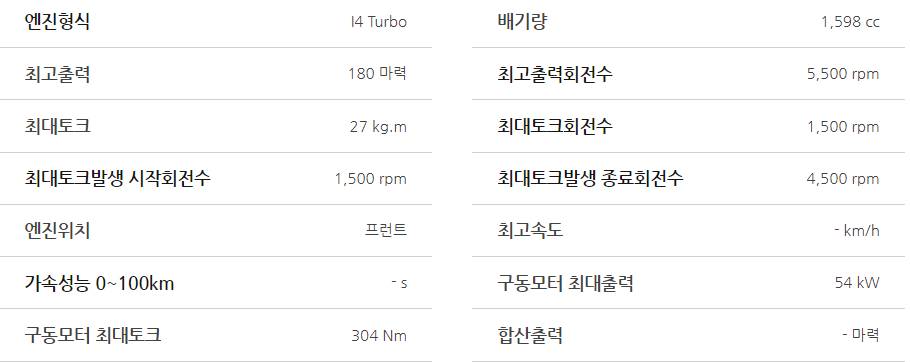 정확한 성능 제원은 모델 연식과 트림에 따라 다를 수 있으므로, 기아자동차 홈페이지 또는 가까운 전시장에서 확인하는 것이 좋습니다. 일반적으로 1.6L 가솔린 터보 엔진과 전기 모터의 조합으로 구성되어 있으며, 준수한 성능을 발휘합니다.