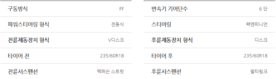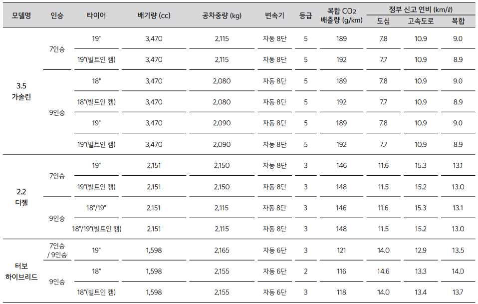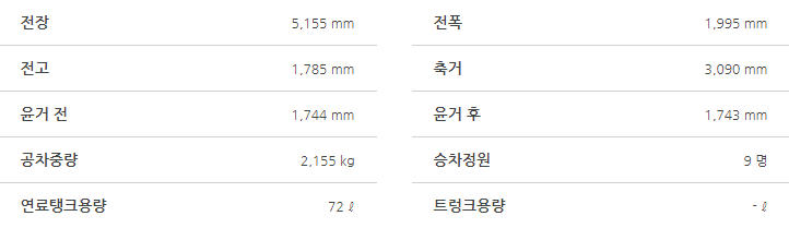 아래는 카니발 하이브리드의 제원표입니다. 차량의 성능에 대해서 상세하게 알아보도록 하겠습니다.