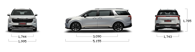 카니발 하이브리드의 크기는 전장 5155mm, 전폭 1995mm, 전고 1785mm, 축거 3090mm입니다.