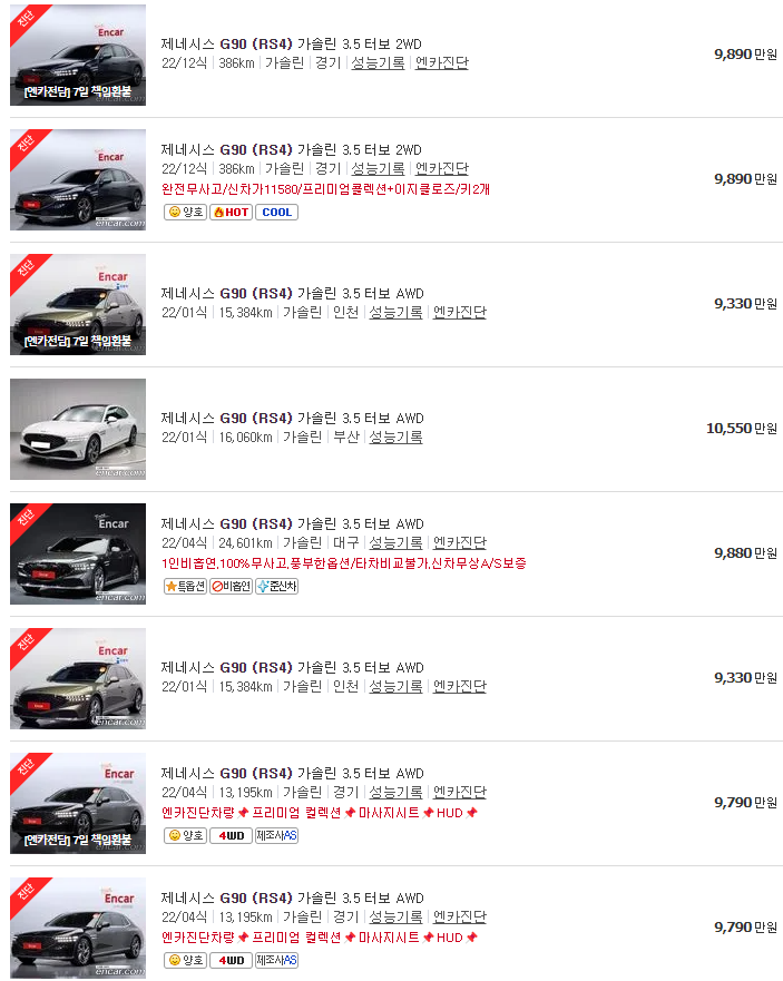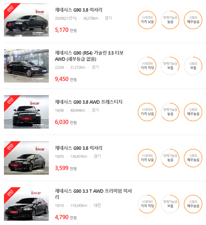 🚗🚗 가장 이용자가 많은 엔카에는 제네시스 G90 중고차 매물이 약 1012대 등록되어 있습니다. 아래는 현재 중고차 시장에서의 제네시스 G90 중고차 시세와 매물표입니다.
