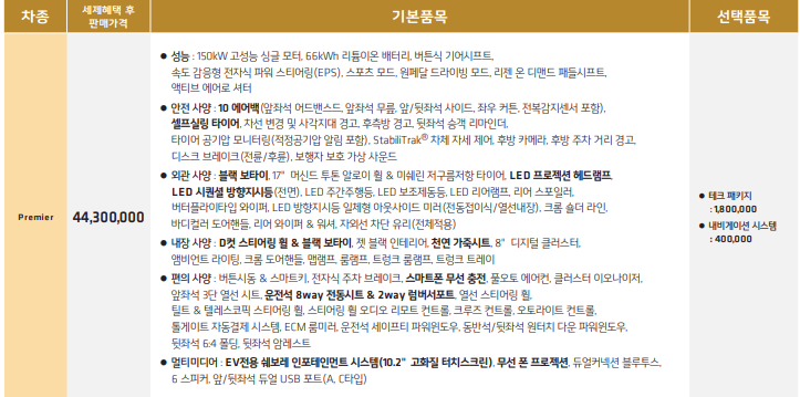 아래는 볼트 EV의 신차 가격표입니다.볼트 EV의 신차 가격은 프리미어 4430만원입니다.