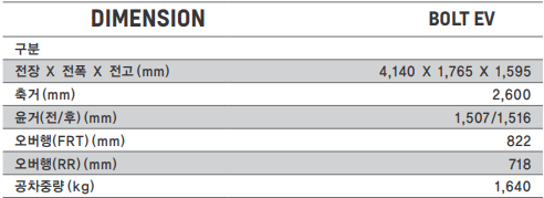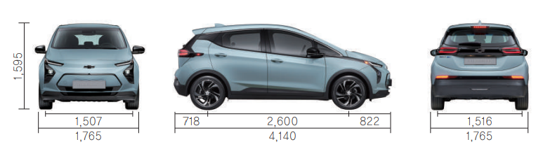 볼트 EV의 크기는 전장 4140, 전폭 1765, 전고 1595, 축거 1516mm입니다.