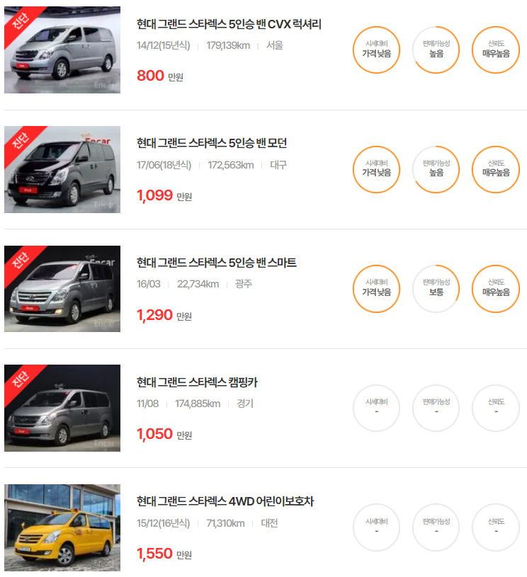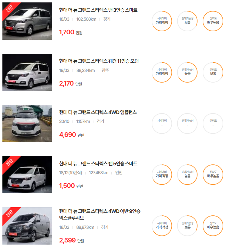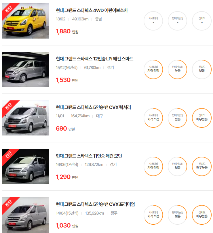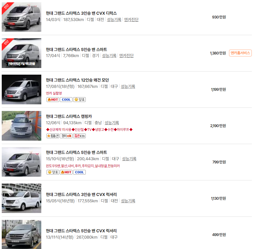 🚗🚗 가장 이용자가 많은 엔카에는 스타렉스 중고차 매물이 약 3028대 등록되어 있습니다. 아래는 현재 중고차 시장에서의 스타렉스 중고차 시세와 매물표입니다.