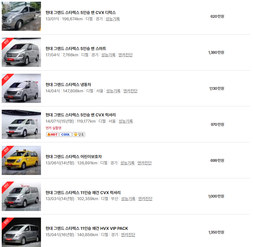 여기까지 스타렉스의 중고차 가격을 알아보았습니다. 스타렉스 중고차 시세가 궁금하셨던 분들은 위 가격표 또는 엔카, Kcar, KB차차차와 같은 중고차 시세 사이트를 참고해서 구매하시면 좋을 것 같습니다.