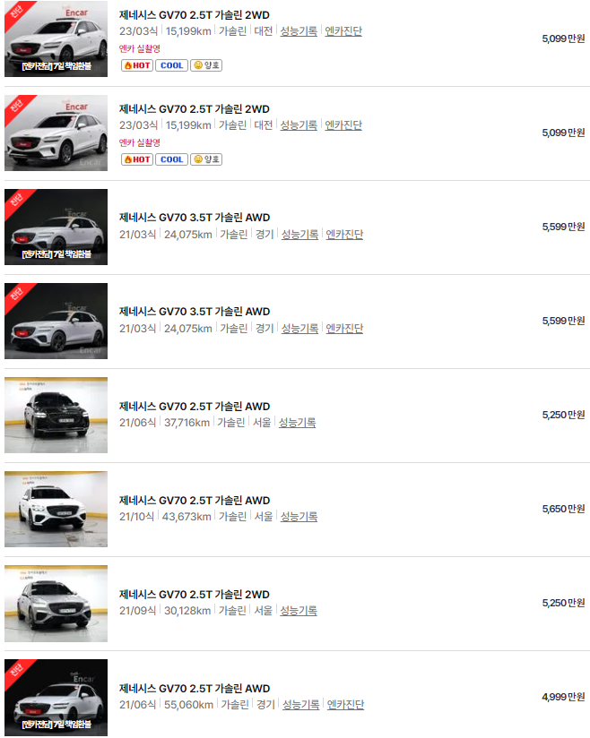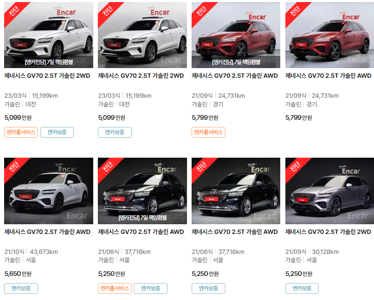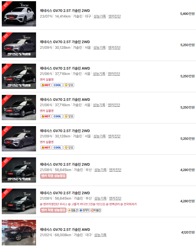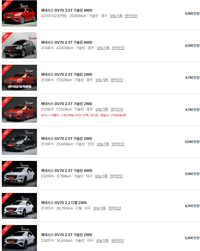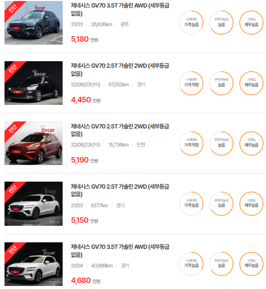 🚗🚗 가장 이용자가 많은 엔카에는 제네시스 gv70 중고차 매물이 약 628대 등록되어 있습니다. 아래는 현재 중고차 시장에서의 제네시스 GV70 중고차 시세와 매물표입니다.