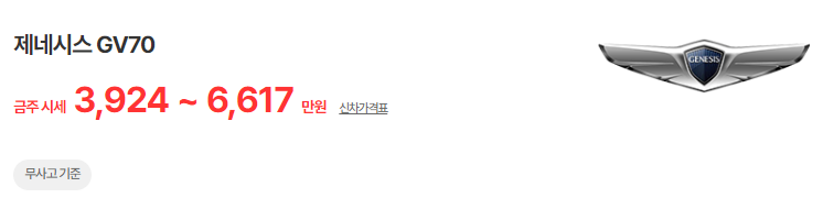 제네시스 GV70는 2021~2024년식 제네시스 GV70 모델이며, 중고차 시세는 3920~6598만 원입니다. 아래는 현재 중고차시장에 매물로 나와있는 제네시스 GV70의 중고차시세와 가격표입니다.