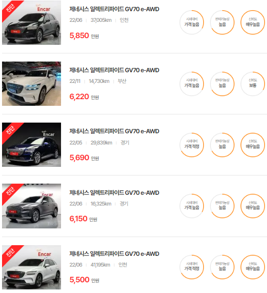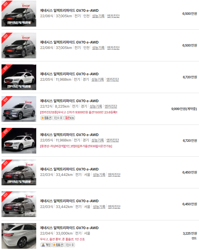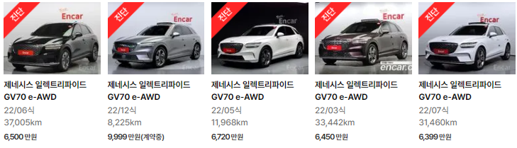 제네시스 일렉트리파이드 GV70는 2022~2024년식 제네시스 GV70 모델이며, 중고차 시세는 6013~8376만 원입니다. 아래는 현재 중고차시장에 매물로 나와있는 제네시스 일렉트리파이드 GV70의 중고차시세와 가격표입니다.