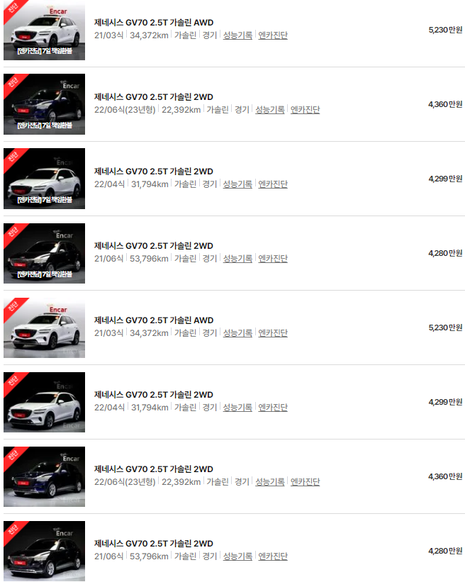 제네시스 gv70 중고차 시세표입니다. 우리나라에서 가장 유명한 중고차 매매사이트인 엔카 사이트에 등록된 중고차 매물 기준입니다. 참고로 국내 중고차 사이트는 엔카, KB차차차, 보배드림 등이 있습니다.