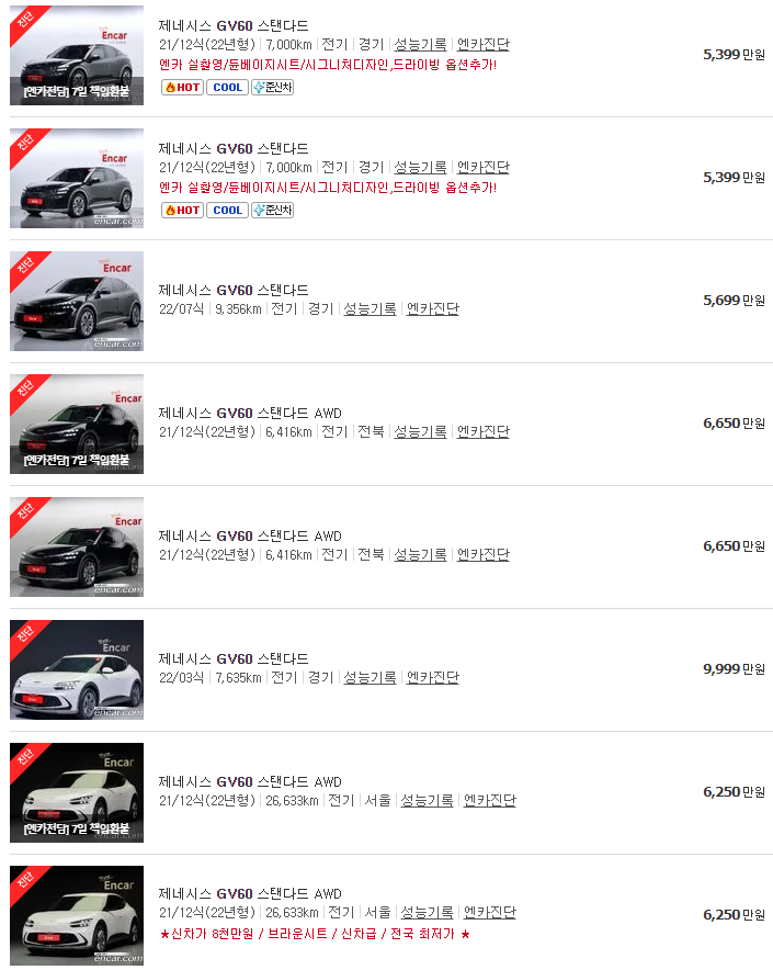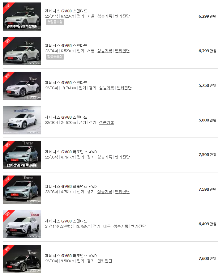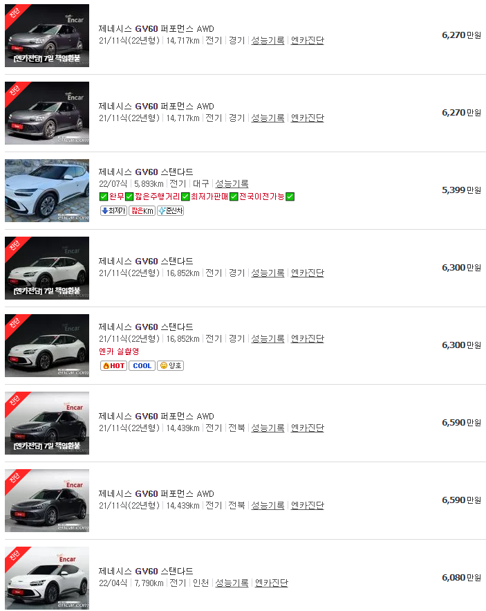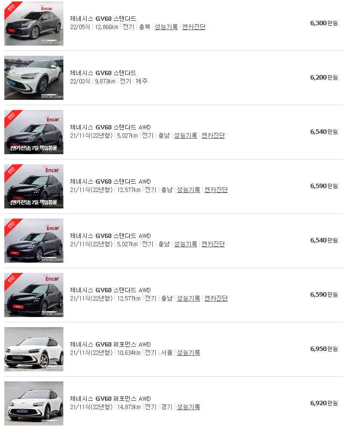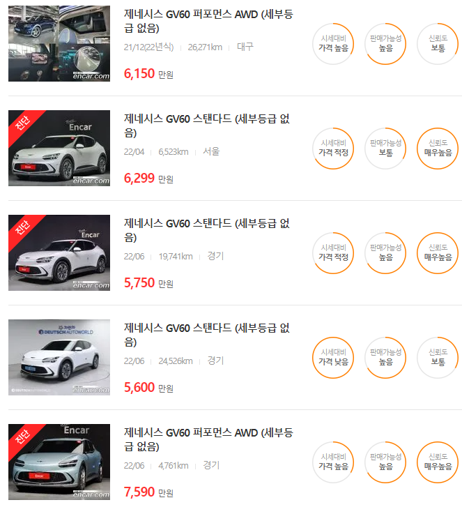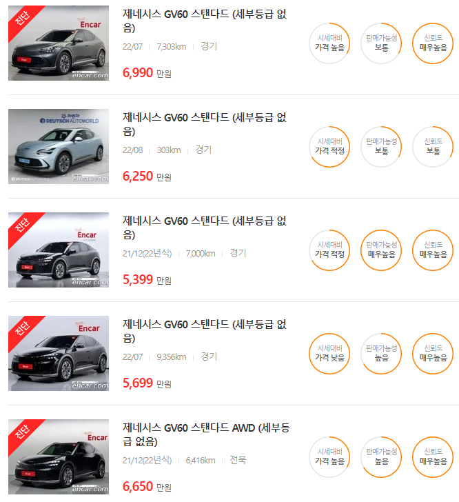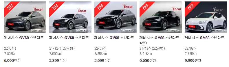 🚗🚗 가장 이용자가 많은 엔카에는 제네시스 gv60 중고차 매물이 약 70대 등록되어 있습니다. 아래는 현재 중고차 시장에서의 제네시스 GV60 중고차 시세와 매물표입니다.