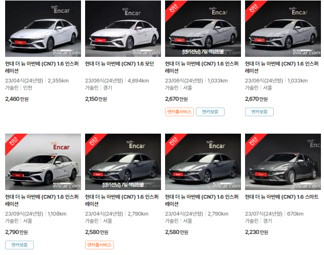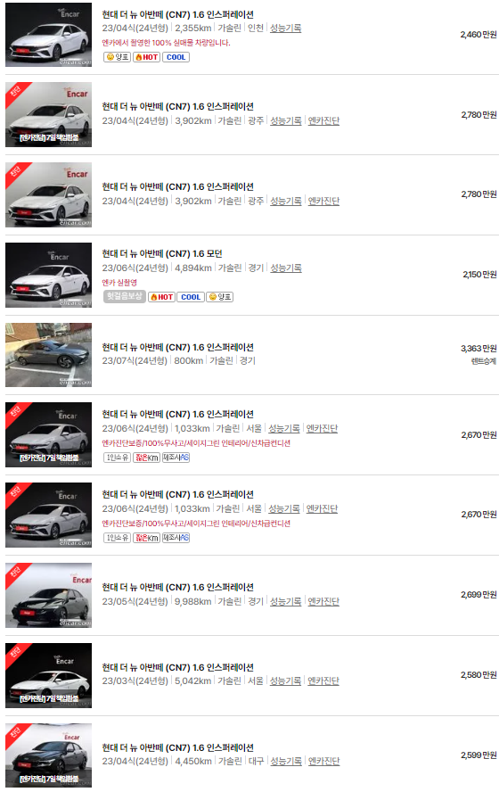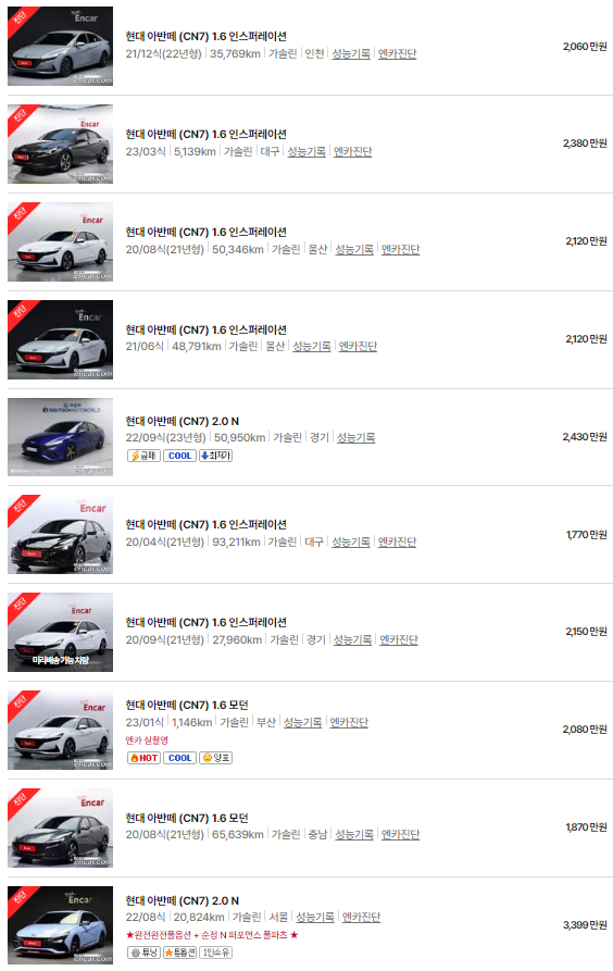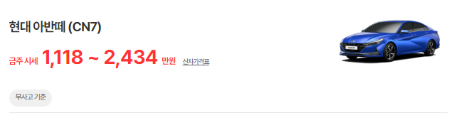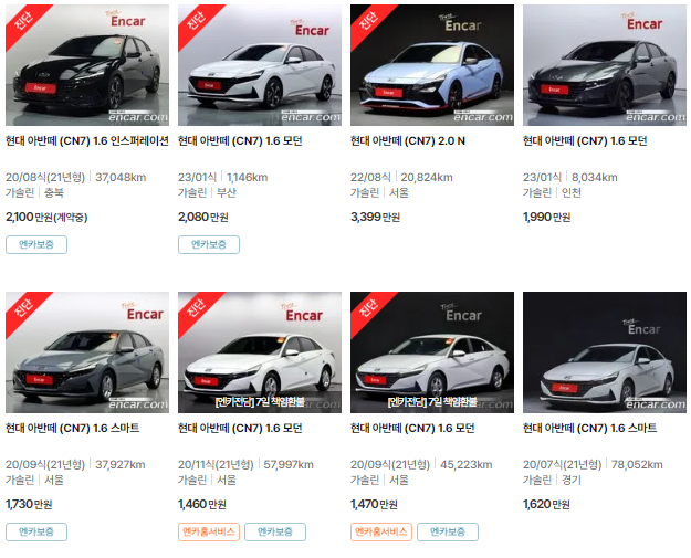 아반떼(CN7)는 2020~2023년식 아반떼 모델이며, 중고차 시세는 1367~3154만 원입니다. 아래는 현재 중고차 시장에 매물로 나와있는 아반떼(CN7)의 중고차 시세와 가격표입니다.