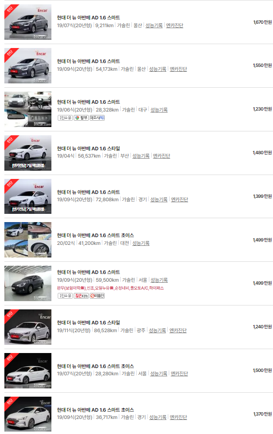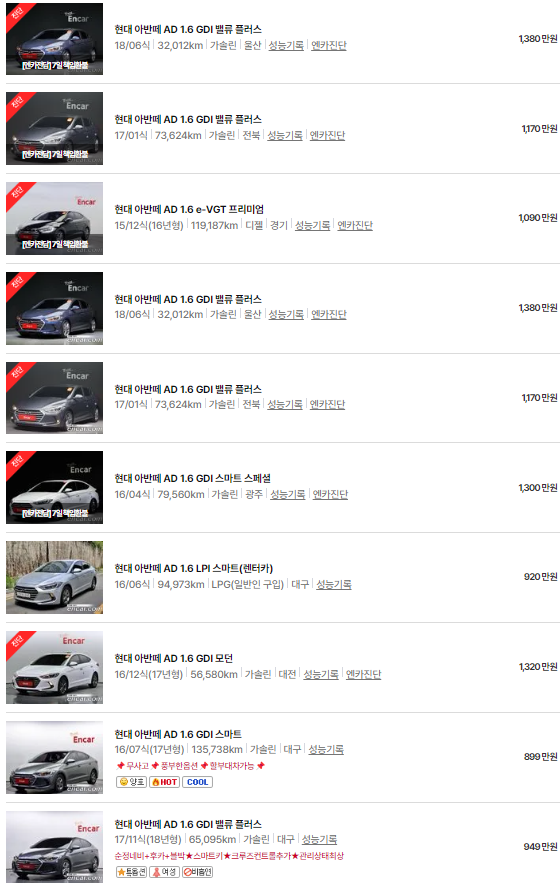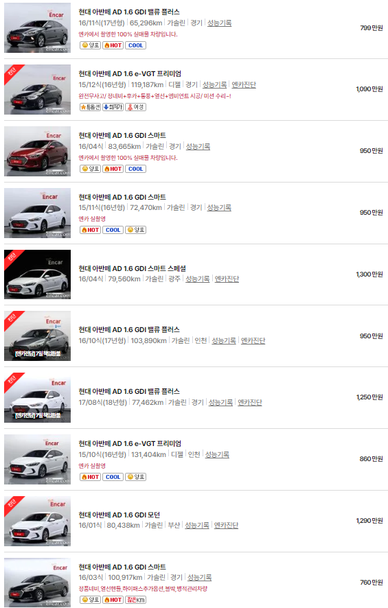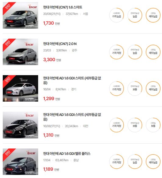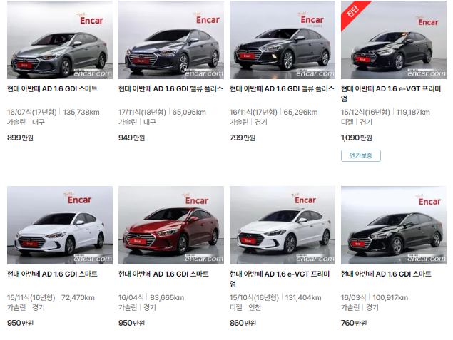 🚗🚗 가장 이용자가 많은 엔카에는 아반떼 중고차 매물이 약 4739대 등록되어 있습니다. 아래는 현재 중고차 시장에서의 아반떼 중고차 시세와 매물표입니다.