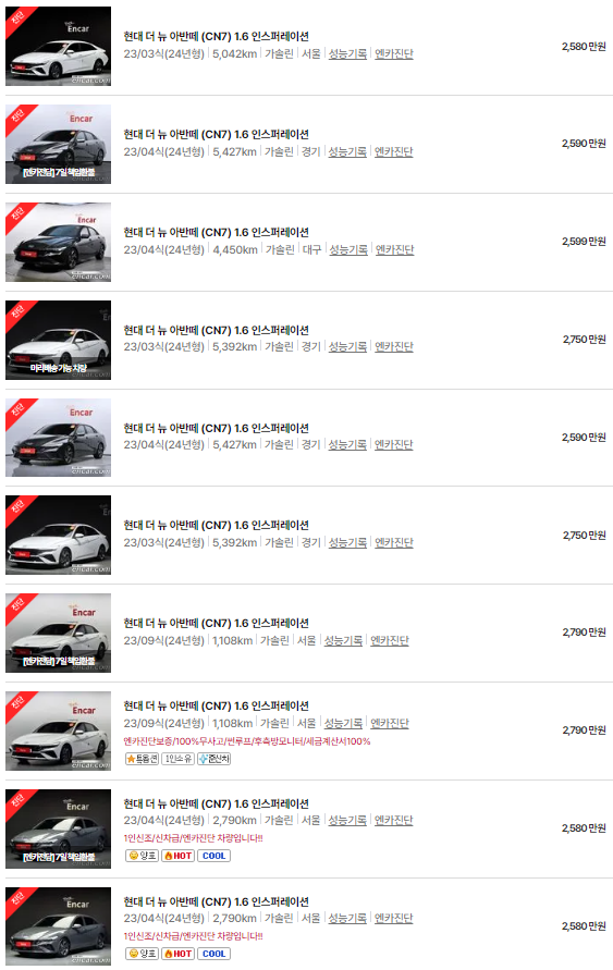 더 뉴 아반떼(CN7)는 2023년식 아반떼 모델이며, 중고차 시세는 1699~3082만 원입니다. 아래는 현재 중고차 시장에 매물로 나와있는 더 뉴 아반떼(CN7)의 중고차 시세와 가격표입니다.