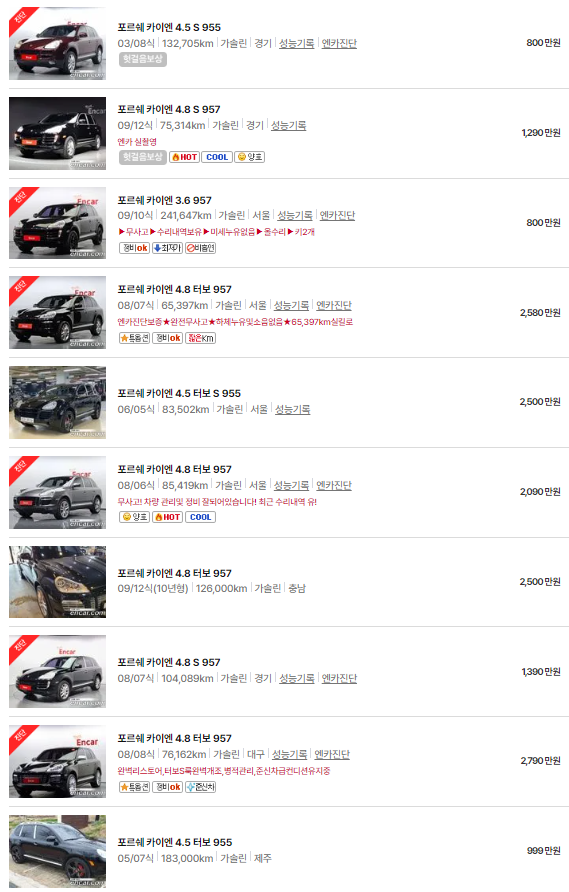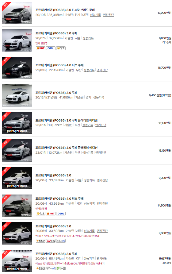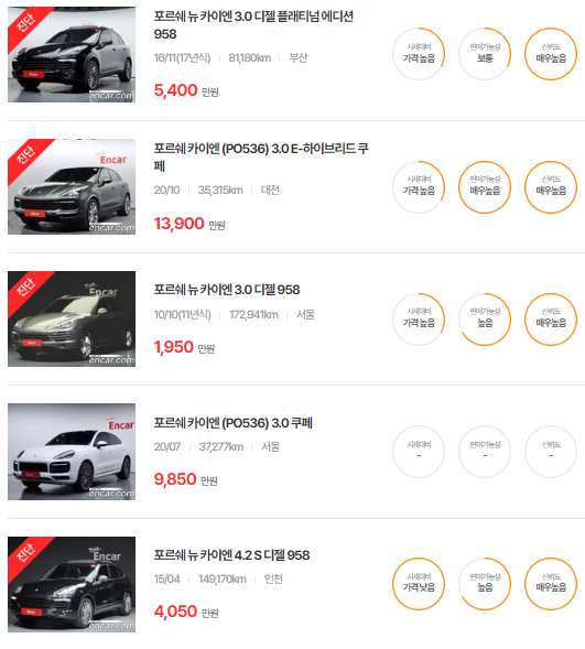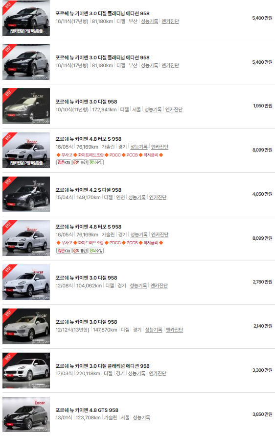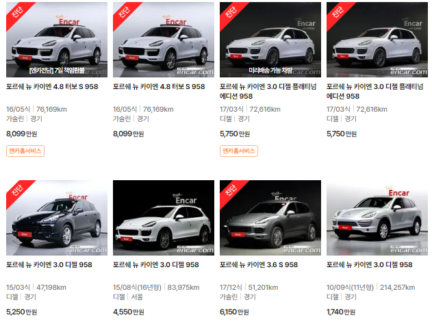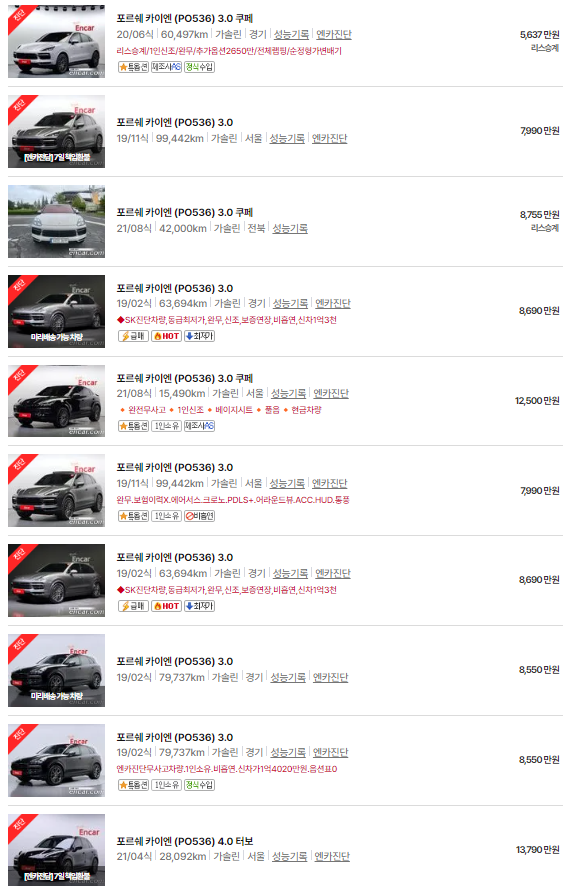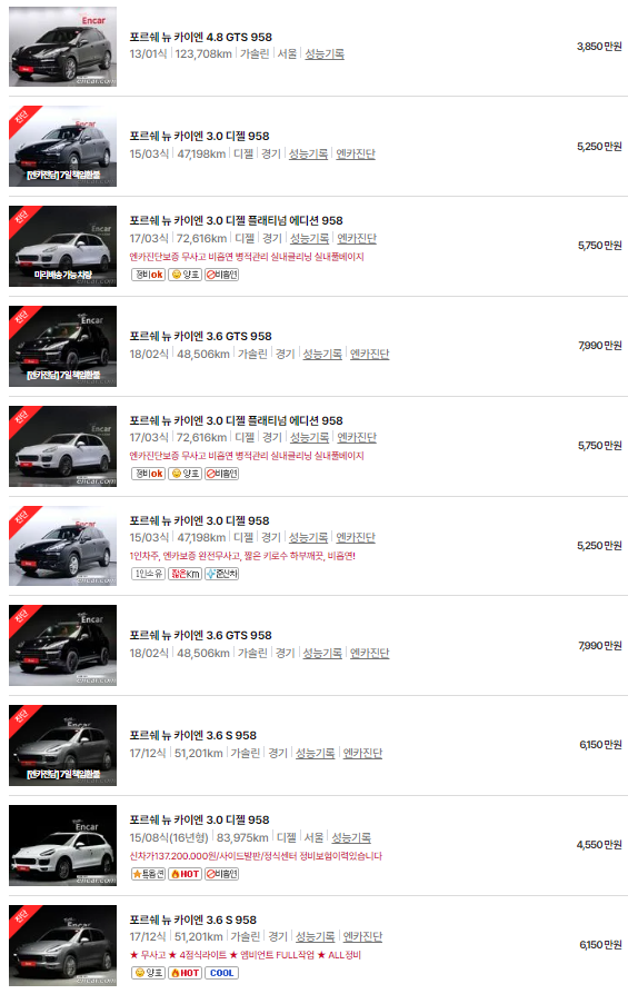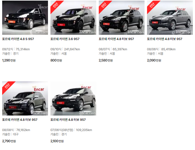카이엔 중고차 시세표입니다. 우리나라에서 가장 유명한 중고차 매매사이트인 엔카 사이트에 등록된 중고차 매물 기준입니다. 참고로 국내 중고차 사이트는 엔카, KB차차차, 보배드림 등이 있습니다.