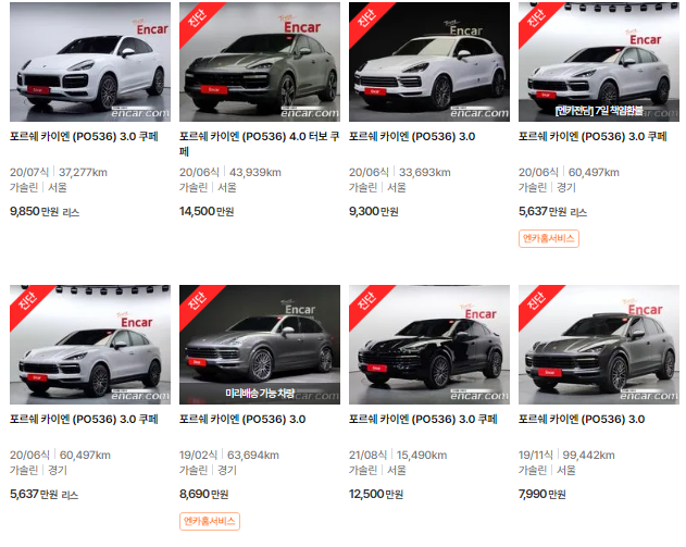 🚗🚗 가장 이용자가 많은 엔카에는 카이엔 중고차 매물이 약 676대 등록되어 있습니다. 아래는 현재 중고차 시장에서의 포르쉐 카이엔 중고차 시세와 매물표입니다.