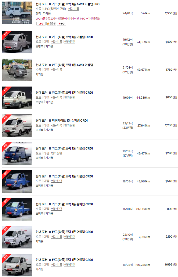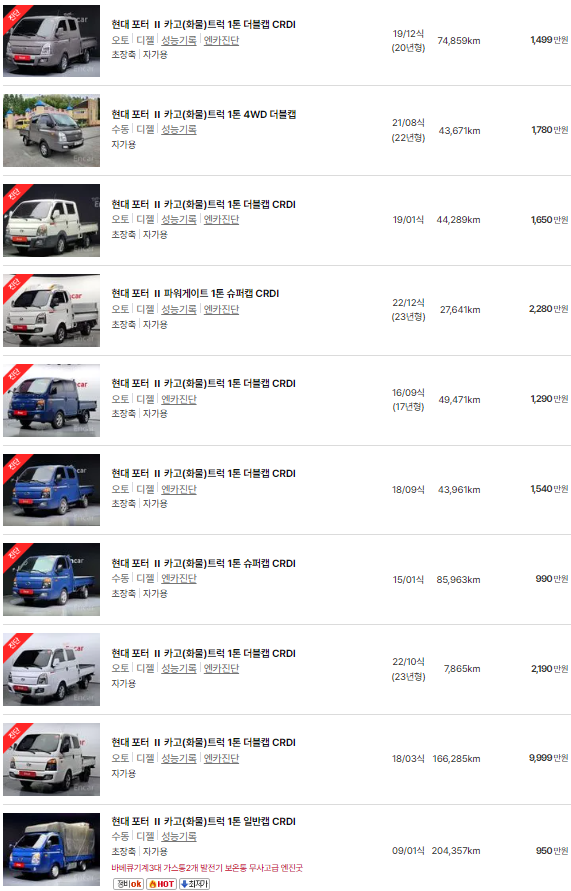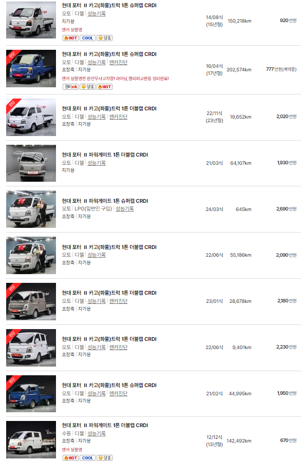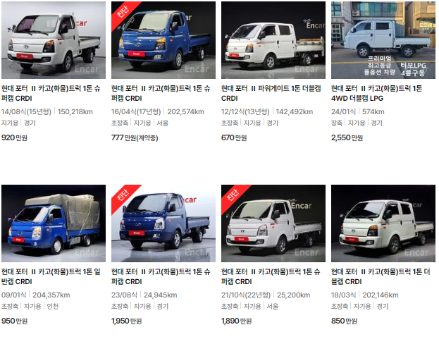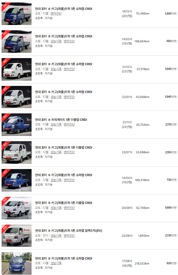 🚗🚗 가장 이용자가 많은 엔카에는 포터 2중고차 매물이 약 3108대 등록되어 있습니다. 아래는 현재 중고차 시장에서의 포터 2 중고차 시세와 매물표입니다.