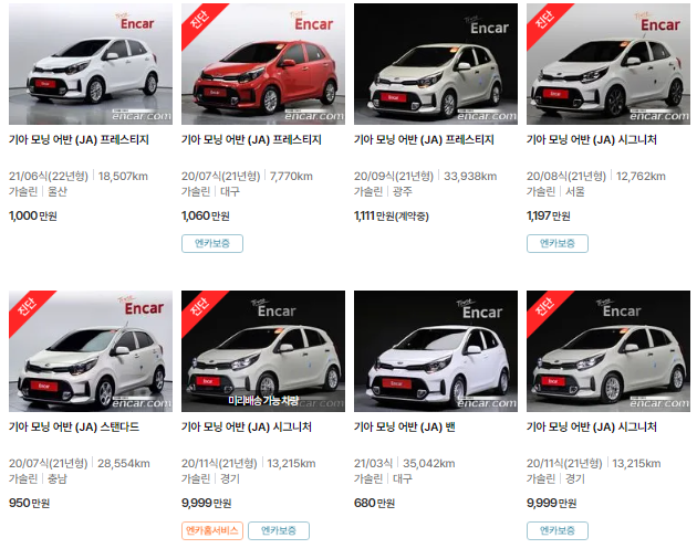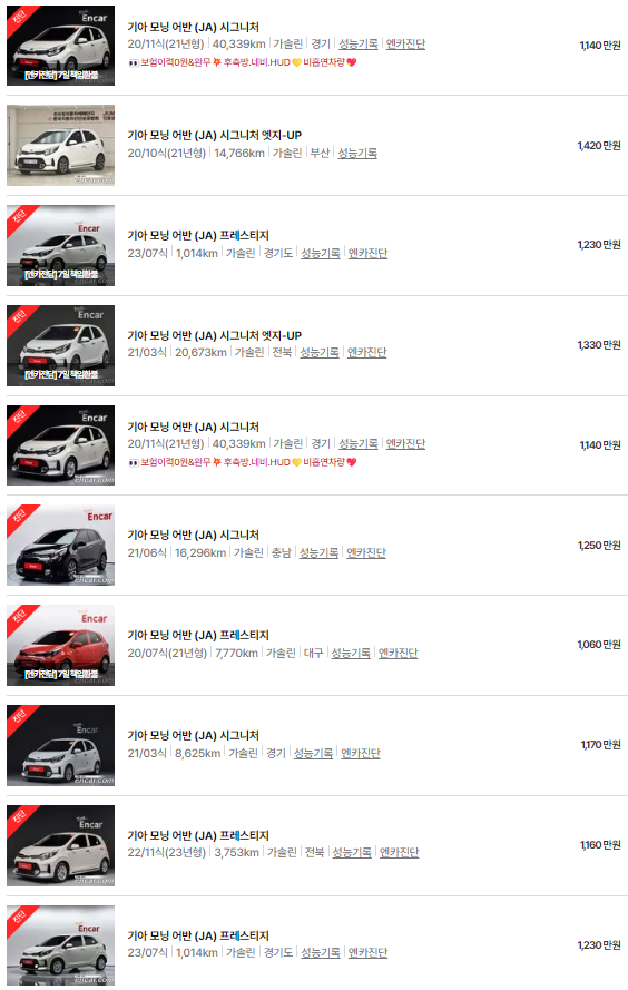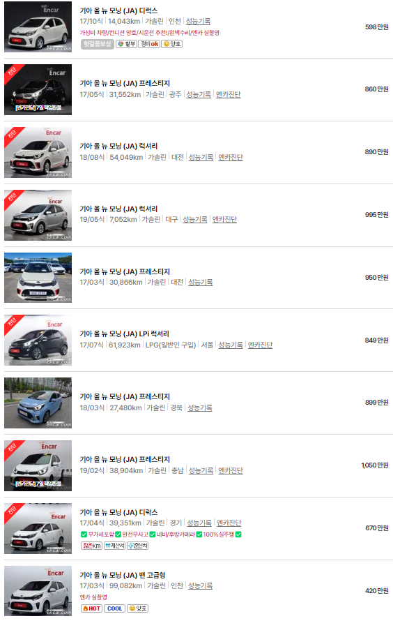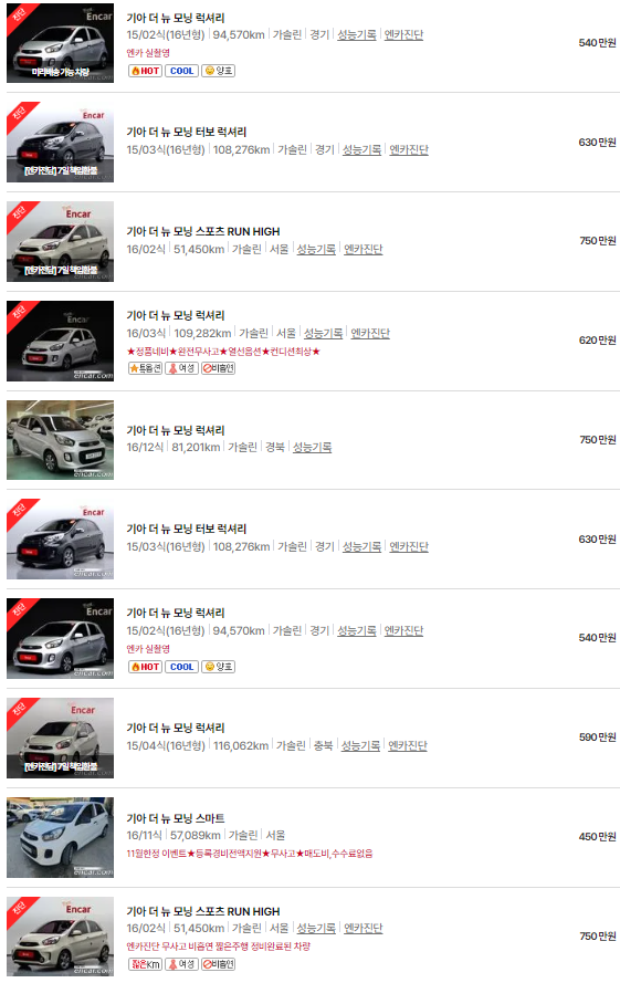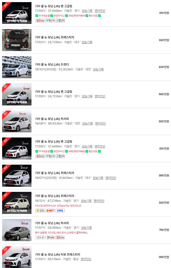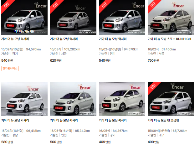 🚗🚗 가장 이용자가 많은 엔카에는 모닝 중고차 매물이 약 3838대 등록되어 있습니다. 아래는 현재 중고차 시장에서의 모닝 중고차 시세와 매물표입니다.