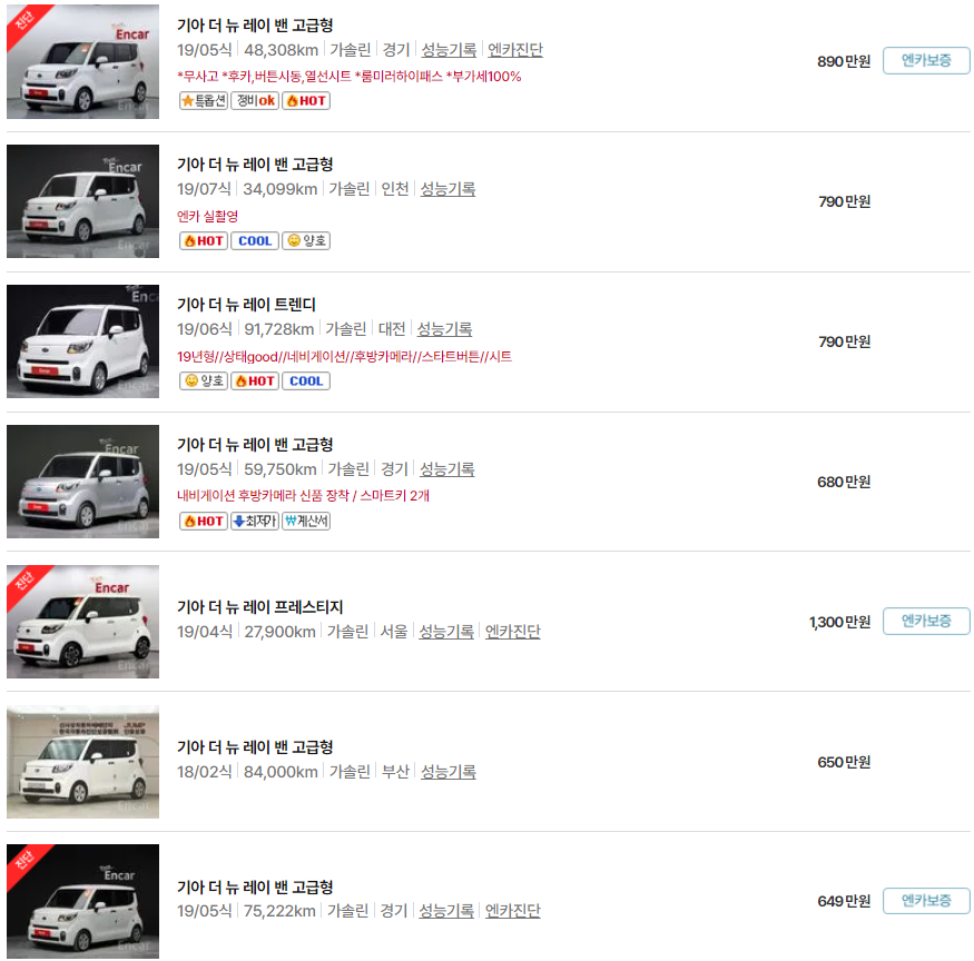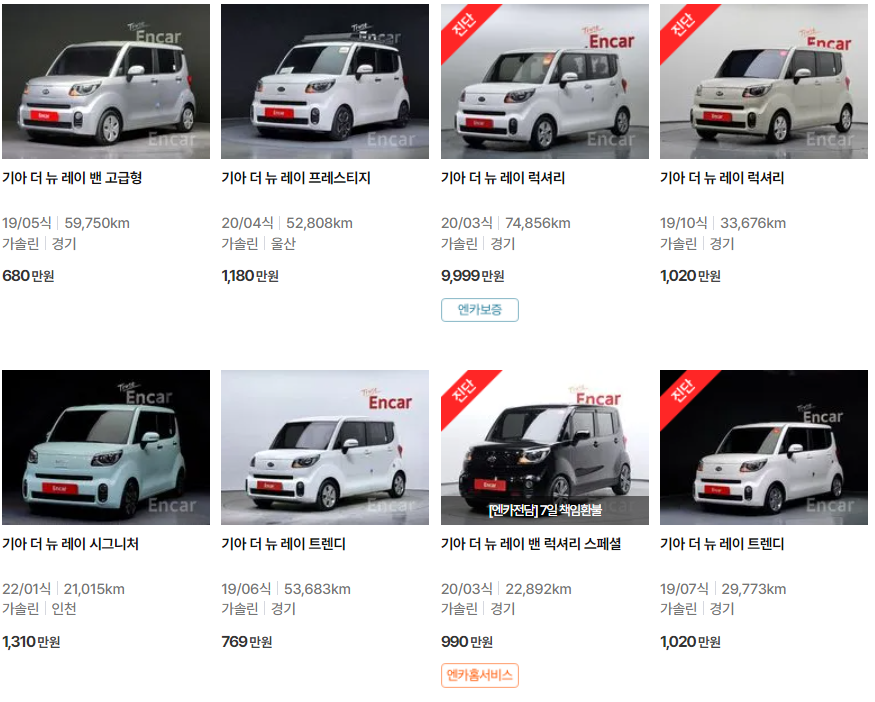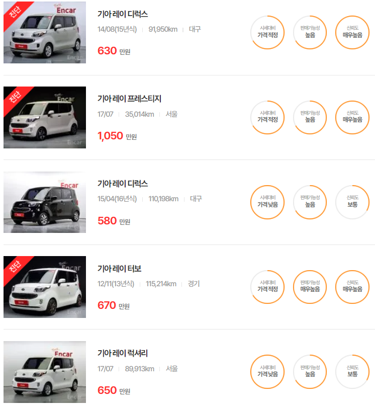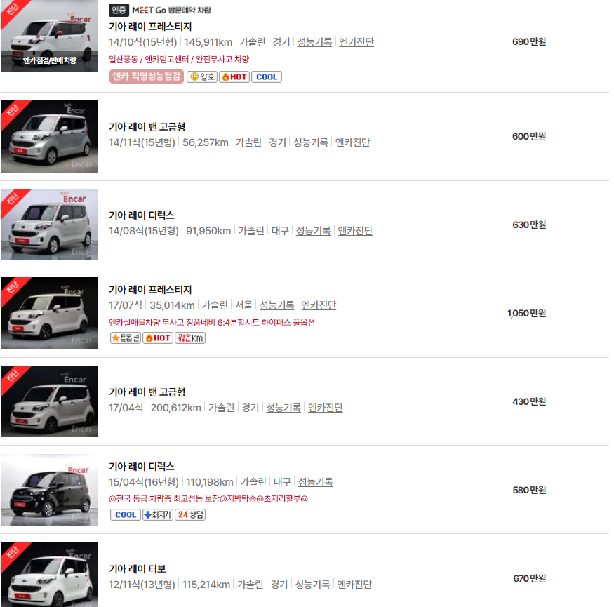 🚗🚗 가장 이용자가 많은 엔카에는 레이중고차 매물이 약 2991대 등록되어 있습니다. 아래는 현재 중고차 시장에서의 레이 중고차 시세와 매물표입니다.