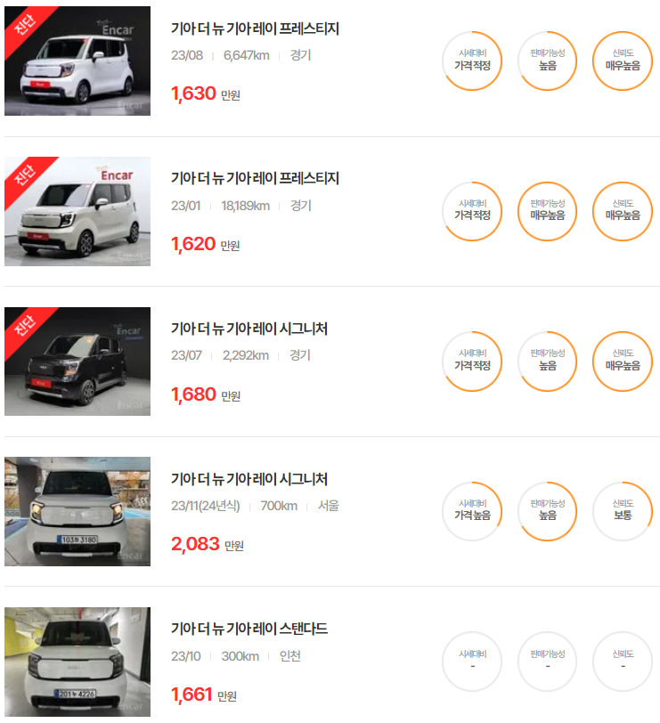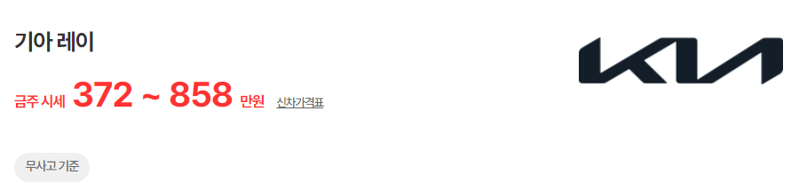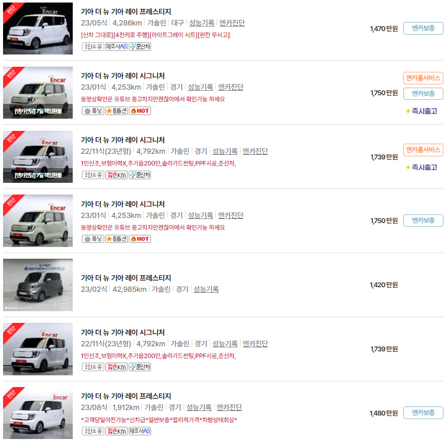 더 뉴 기아 레이는 2022~2023년식 레이 모델이며, 중고차 시세는 1214~1809만 원입니다. 아래는 현재 중고차시장에 매물로 나와있는 더 뉴 기아 레이의 중고차시세와 가격표입니다.