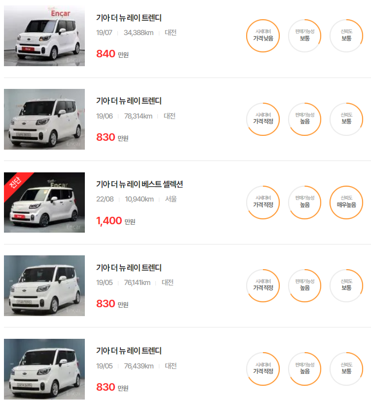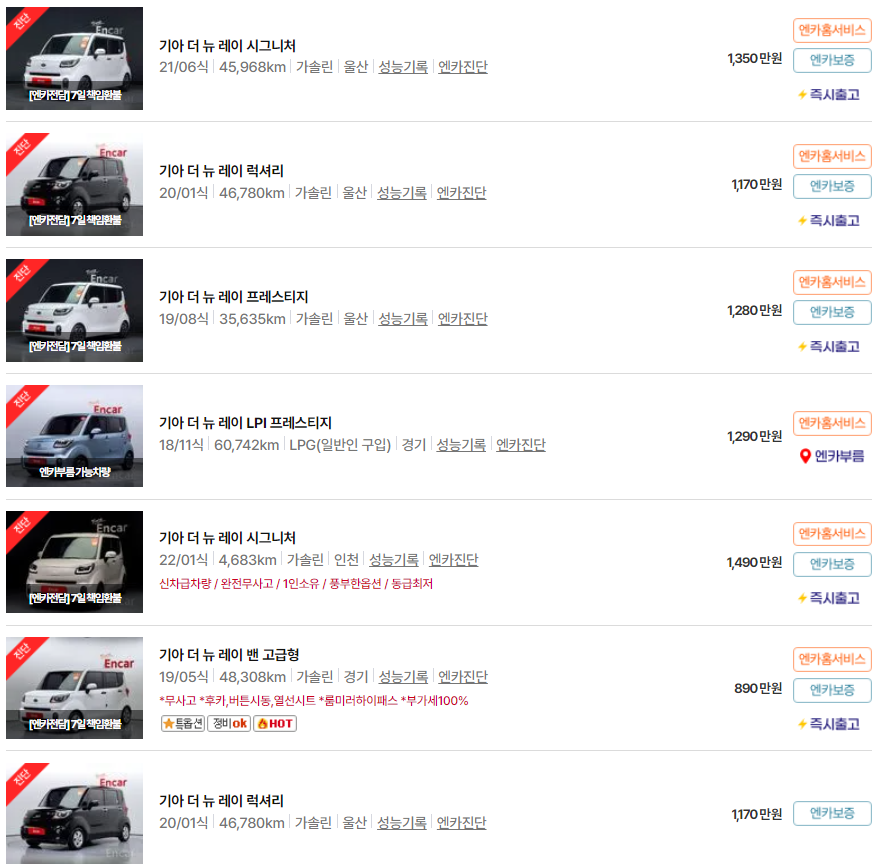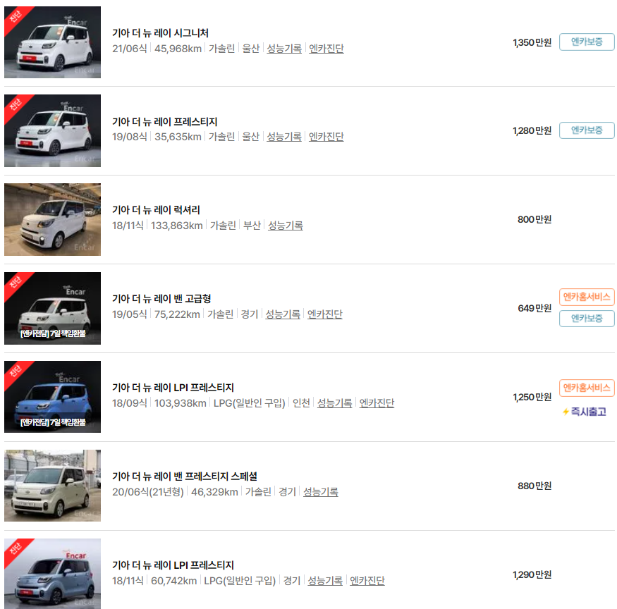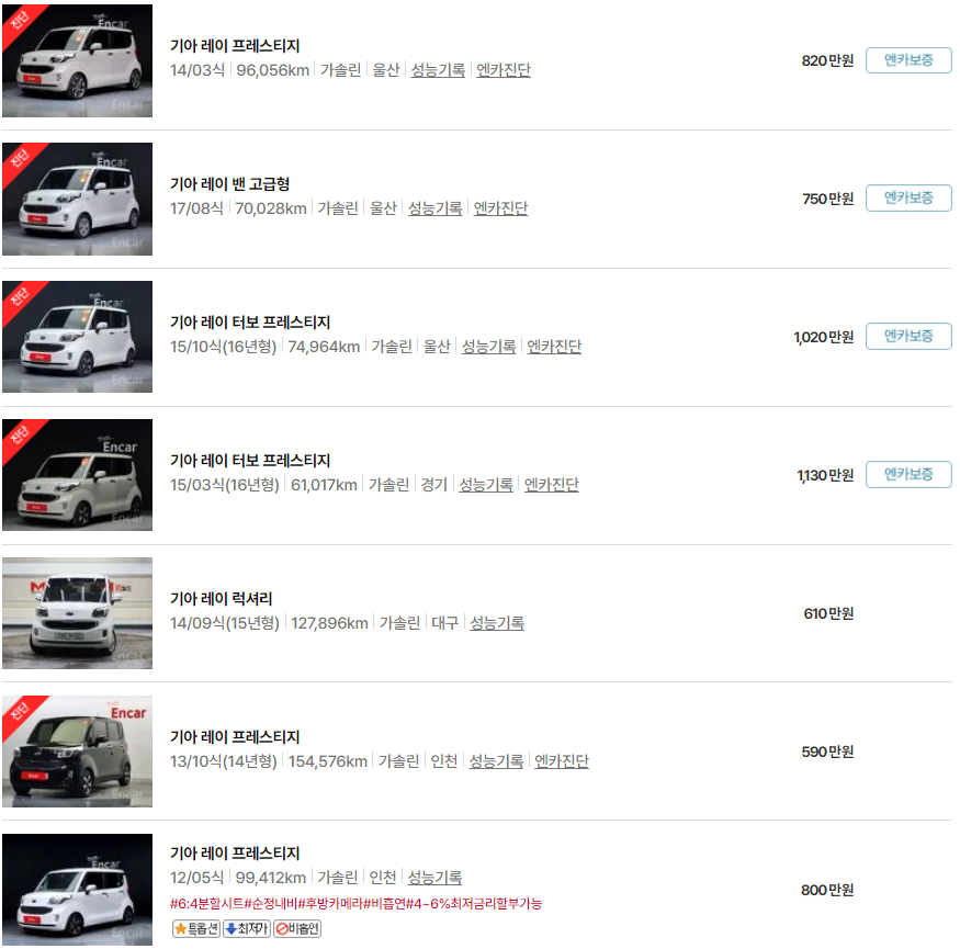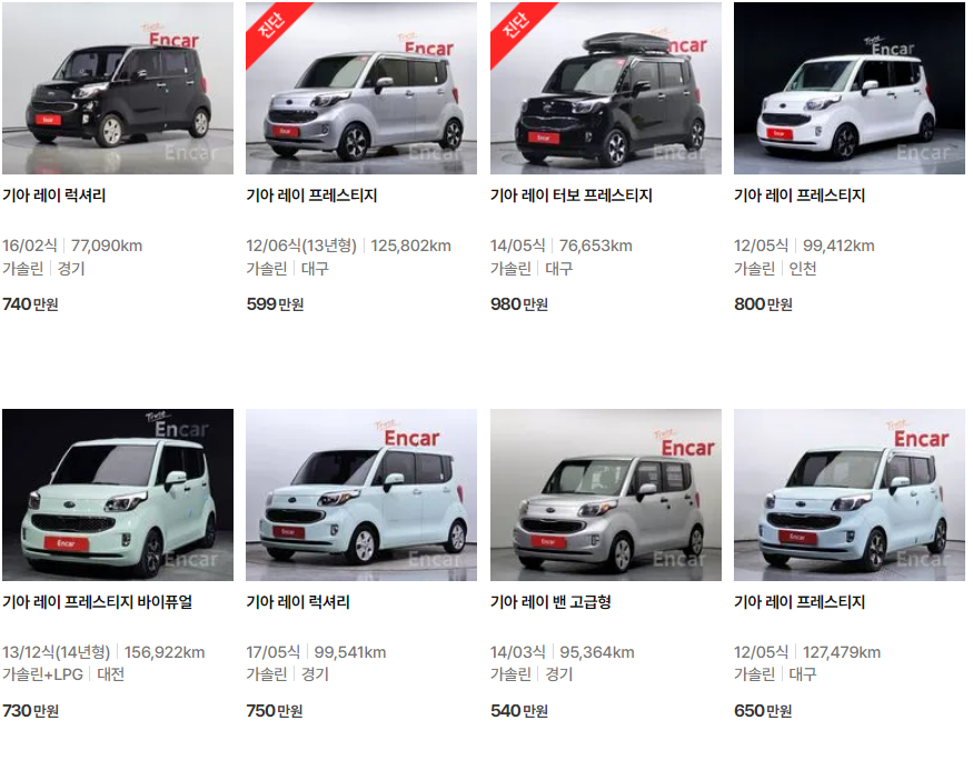 여기까지 레이의 중고차 가격을 알아보았습니다. 레이 중고차 시세가 궁금하셨던 분들은 위 가격표 또는 엔카, Kcar, KB차차차와 같은 중고차 시세 사이트를 참고해서 구매하시면 좋을 것 같습니다.