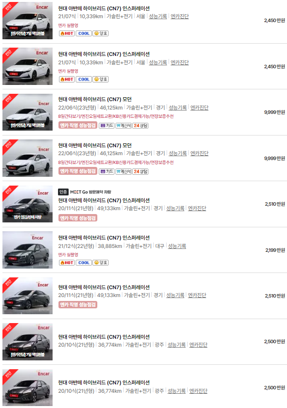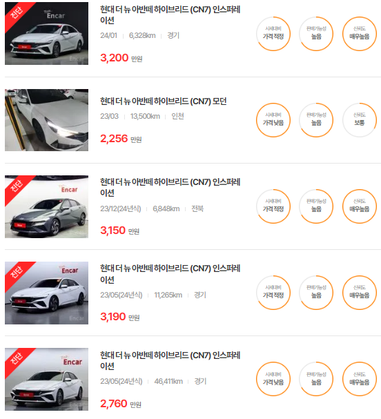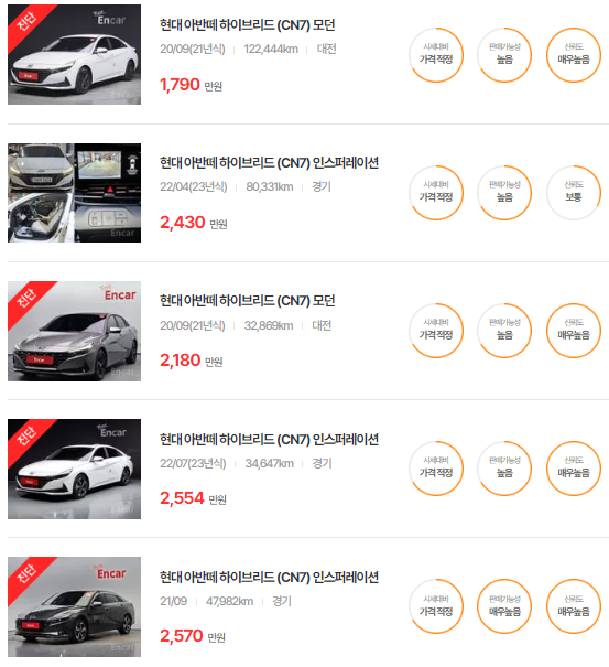 🚗🚗 가장 이용자가 많은 엔카에는 아반떼 하이브리드 중고차 매물이 약 115대 등록되어 있습니다. 아래는 현재 중고차 시장에서의 아반떼 하이브리드 중고차 시세와 매물표입니다.