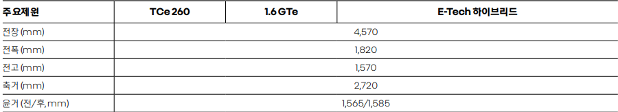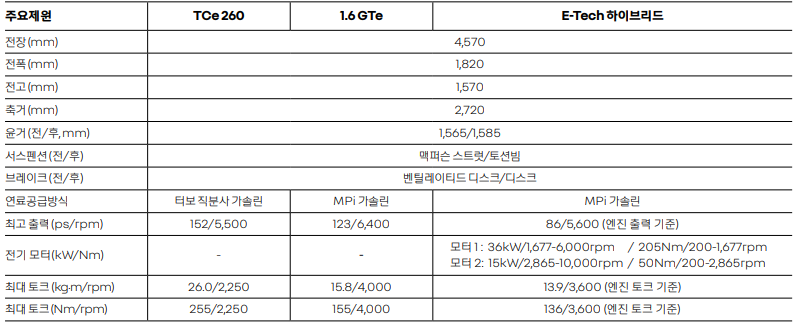 아래는 XM3의 제원표입니다. 차량의 성능에 대해서 상세하게 알아보도록 하겠습니다.