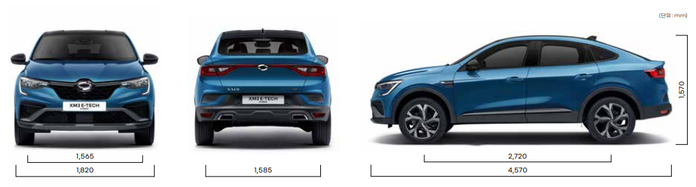 XM3의 크기는 전장 4570, 전폭 1820, 전고 1570, 축거 2720mm입니다.